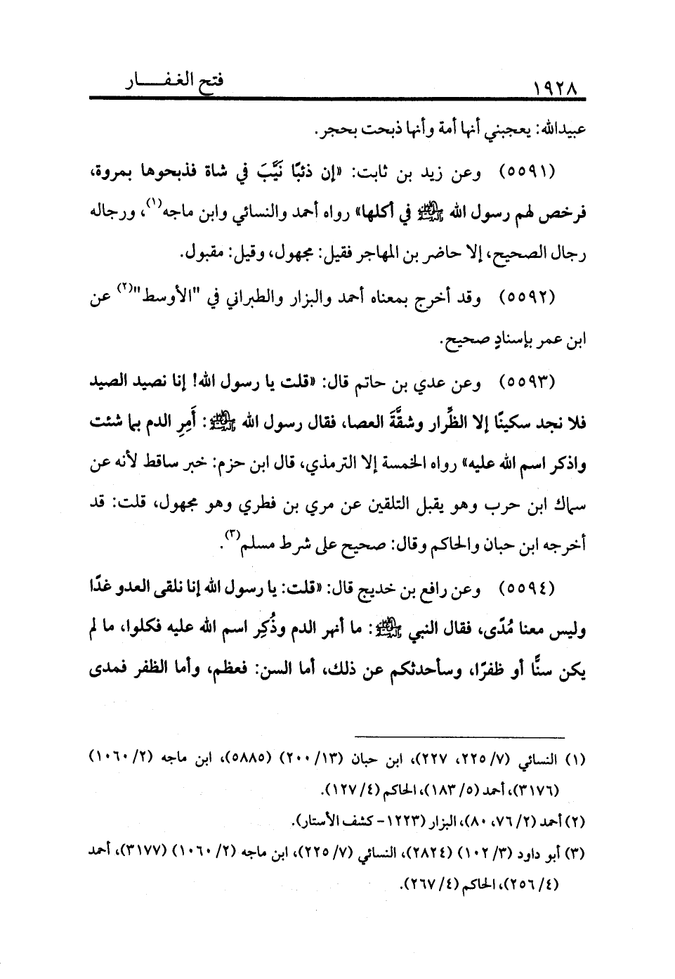 5593 - وعن عدي بن حاتم قال: «قلت يا رسول الله! إنا نصيد الصيد فلا نجد سكينًا إلا الظرار وشقة العصا. فقال رسول الله - صلى الله عليه وسلم -: أمر الدم بما شئت واذكر اسم الله عليه» رواه الخمسة إلا الترمذي، قال ابن حزم: خبر ساقط لأنه عن سماك ابن حرب وهو يقبل التلقين عن مري بن فطري وهو مجهول قلت: قد أخرجه ابن حبان والحاكم، وقال: صحيح على شرط مسلم (¬3) .