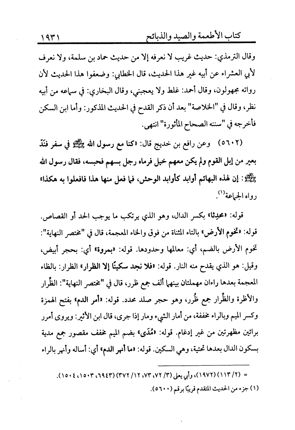 5602 - وعن رافع بن خديج قال: «كنا مع رسول الله - صلى الله عليه وسلم - في سفر فند بعير من إبل القوم ولم يكن معهم خيل فرماه رجل بسهم فحبسه، فقال رسول الله - صلى الله عليه وسلم -: إن لهذه البهائم أوابد كأوابد الوحش، فما فعل منها هذا فافعلوا به هكذا» رواه الجماعة (¬1) .