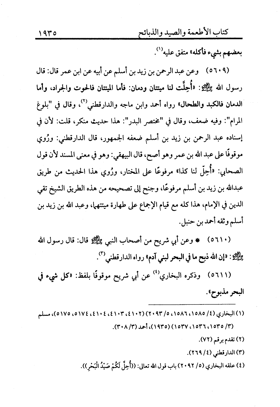 5609 - وعن عبد الرحمن بن زيد بن أسلم عن أبيه عن ابن عمر قال: قال رسول الله - صلى الله عليه وسلم -: «أحلت لنا ميتتان ودمان: فأما الميتتان فالحوت والجراد، وأما الدمان فالكبد والطحال» رواه أحمد وابن ماجة والدارقطني (¬2) ، وقال في "بلوغ المرام": وفيه ضعف. وقال في "مختصر البدر": هذا حديث منكر، قلت: لأن في إسناده عبد الرحمن بن زيد بن أسلم ضعفه الجمهور، قال الدارقطني: وروي موقوفًا على عبد الله بن عمر وهو أصح. قال البيهقي: وهو في معنى المسند لأن قول الصحابي: أحل لنا كذا مرفوعًا على المختار. وروي هذا الحديث من طريق عبد الله بن زيد بن أسلم مرفوعًا وجنح إلى تصحيحه من هذه الطريق الشيخ تقي الدين في الإمام. هذا كله مع قيام الإجماع على طهارة ميتتهما، وعبد الله بن زيد بن أسلم وثقه أحمد بن حنبل.
