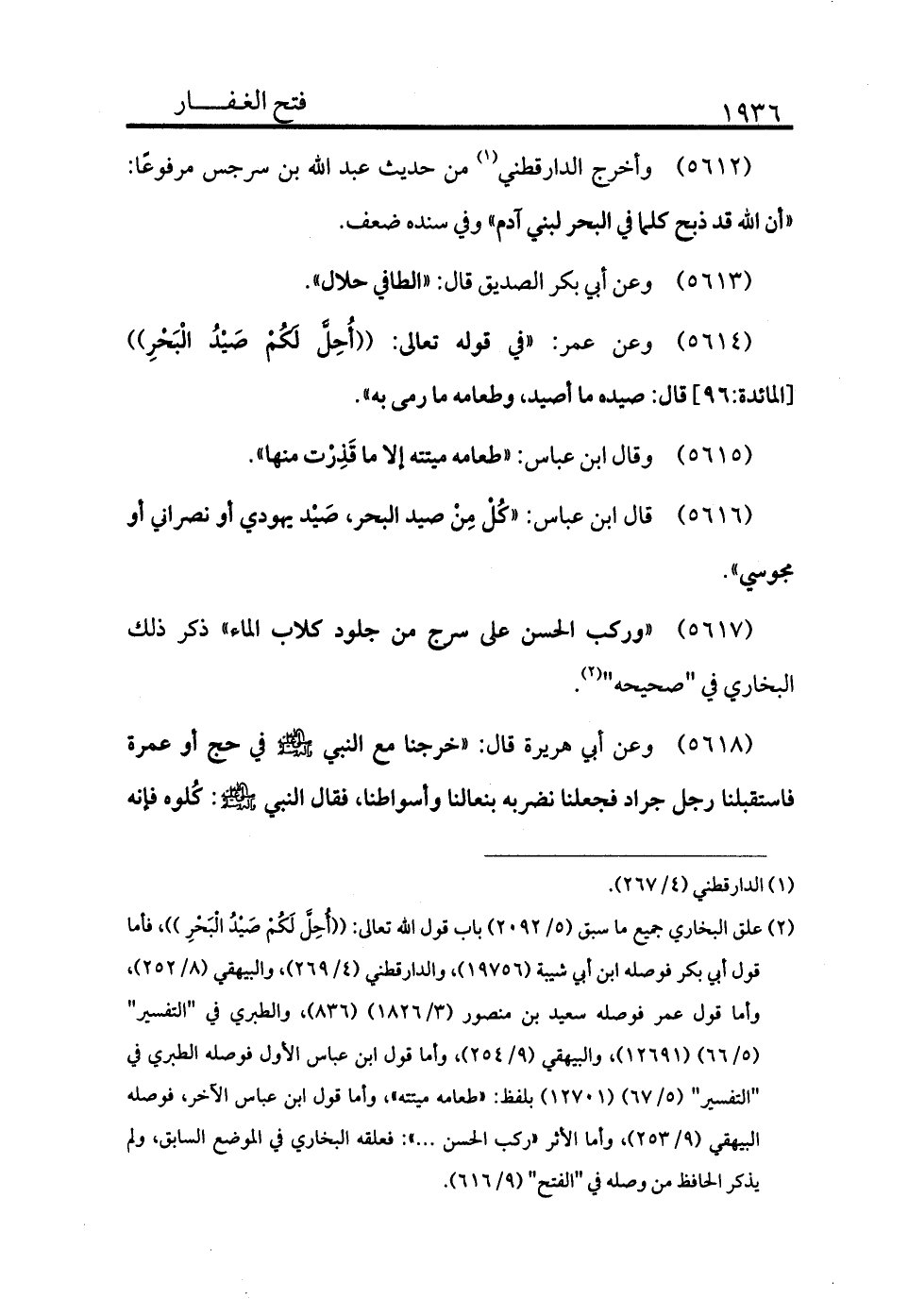 5614 - وعن عمر «في قوله تعالى: ((أُحِلَّ لَكُمْ صَيْدُ الْبَحْرِ)) [المائدة:96] قال: صيده ما أصيد وطعامه ما رمي به» .
