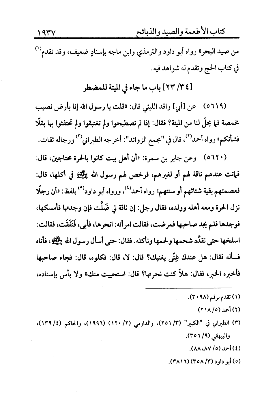 5619 - عن أبي واقد الليثي قال: «قلت يا رسول الله إنا بأرض نصيب مخمصة فما يحل لنا من الميتة؟ فقال: إذا لم تصطبحوا ولم تغتبقوا ولم تحتفئوا بها بقلًا فشأنكم» رواه أحمد (¬2) . قال في "مجمع الزوائد": أخرجه الطبراني (¬3) ورجاله ثقات.