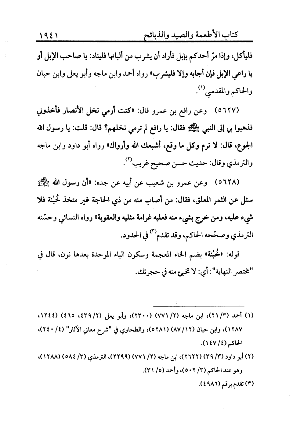 5627 - وعن رافع بن عمرو قال: «كنت أرمي نخل الأنصار فأخذوني فذهبوا بي إلى النبي - صلى الله عليه وسلم - فقال: يا رافع لم ترم نخلهم؟ قال: قلت: يا رسول الله الجوع. قال: لا ترم وكل ما وقع، أشبعك الله وأرواك» رواه أبو داود وابن ماجة والترمذي، وقال: حديث حسن صحيح غريب (¬2) .