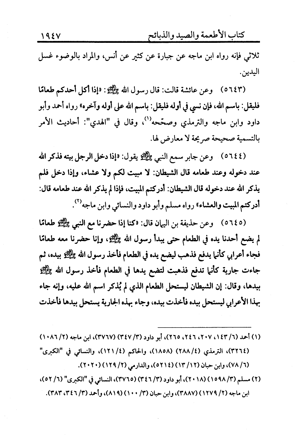 5645 - وعن حذيفة بن اليمان قال: «كنا إذا حضرنا مع النبي - صلى الله عليه وسلم - طعامًا لم يضع أحدنا يده في الطعام حتى يبدأ رسول الله - صلى الله عليه وسلم -، وإنا حضرنا معه طعامًا فجاء أعرابي كأنما يدفع فذهب ليضع يده في الطعام فأخذ رسول الله بيده ثم جاءت جارية كأنما تدفع فذهبت لتضع يدها في الطعام فأخذ رسول الله - صلى الله عليه وسلم - بيدها، وقال: إن الشيطان يستحل الطعام الذي لم يذكر اسم الله عليه، وإنه جاء بهذا الأعرابي يستحل بيده فأخذت بيده، وجاء بهذه الجارية يستحل بيدها فأخذت