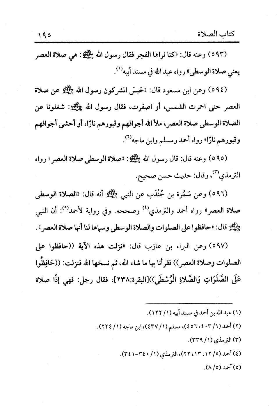 593 - وعنه قال: «كنا نراها الفجر فقال رسول الله - صلى الله عليه وسلم -: هي صلاة العصر يعني صلاة الوسطى» رواه عبد الله في مسند أبيه (¬1) .