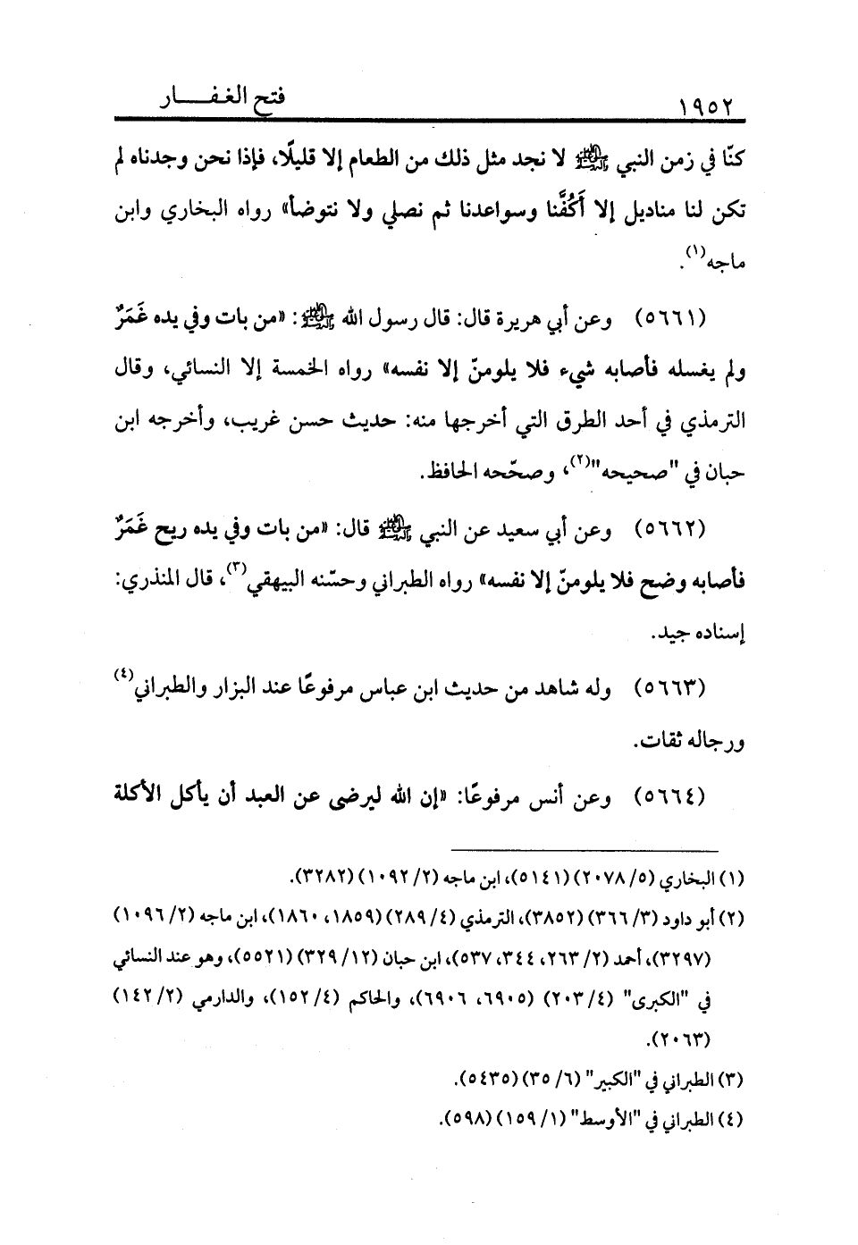 5661 - وعن أبي هريرة قال: قال رسول الله - صلى الله عليه وسلم -: «من بات وفي يده غمر ولم يغسله فأصابه شيء فلا يلومن إلا نفسه» رواه الخمسة إلا النسائي، وقال الترمذي: في أحد الطرق التي أخرجها منه: حديث حسن غريب، وأخرجه ابن حبان في "صحيحه" (¬2) وصححه الحافظ.