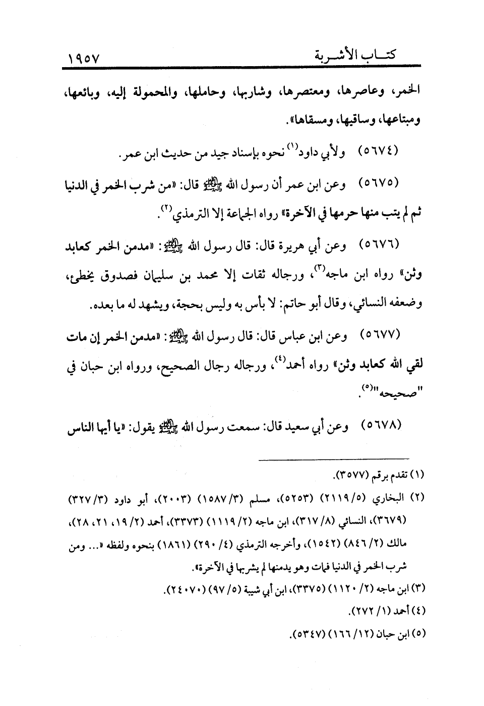 5677 - وعن ابن عباس قال: قال رسول الله - صلى الله عليه وسلم -: «مدمن الخمر إن مات لقي الله كعابد وثن» رواه أحمد (¬4) ورجاله رجال الصحيح، ورواه ابن حبان في "صحيحه" (¬5) .