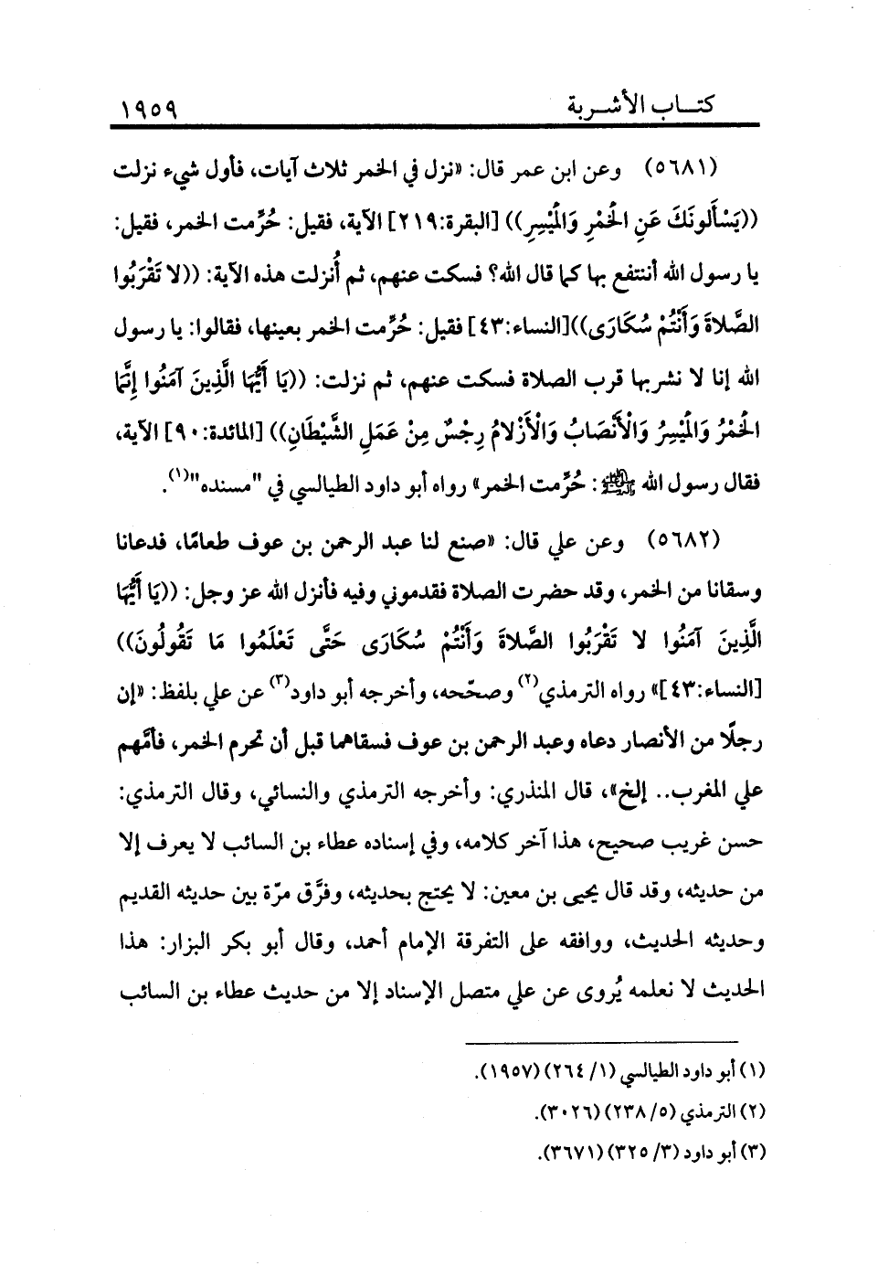 5682 - وعن علي قال: «صنع لنا عبد الرحمن بن عوف طعامًا فدعانا وسقانا من الخمر، وقد حضرت الصلاة فقدموني وفيه فأنزل الله عز وجل: ((يَا أَيُّهَا الَّذِينَ آمَنُوا لا تَقْرَبُوا الصَّلاةَ وَأَنْتُمْ سُكَارَى حَتَّى تَعْلَمُوا مَا تَقُولُونَ)) [النساء:43] » رواه الترمذي (¬2) وصححه وأخرجه أبو داود (¬3) عن علي بلفظ: «إن رجلًا من الأنصار دعاه وعبد الرحمن بن عوف فسقاهما قبل أن تحرم الخمر فأمهم علي المغرب.. إلخ» قال المنذري: وأخرجه الترمذي والنسائي، وقال الترمذي: حسن غريب صحيح، هذا آخر كلامه، وفي إسناده عطاء بن السائب لا يعرف إلا من حديثه، وقد قال يحيى بن معين: لا يحتج بحديثه، وفرق مرة بين حديثه القديم وحديثه الحديث، ووافقه على التفرقة الإمام أحمد، وقال أبو بكر البزار: هذا الحديث لا نعلمه يروى عن علي متصل الإسناد إلا من حديث عطاء بن السائب