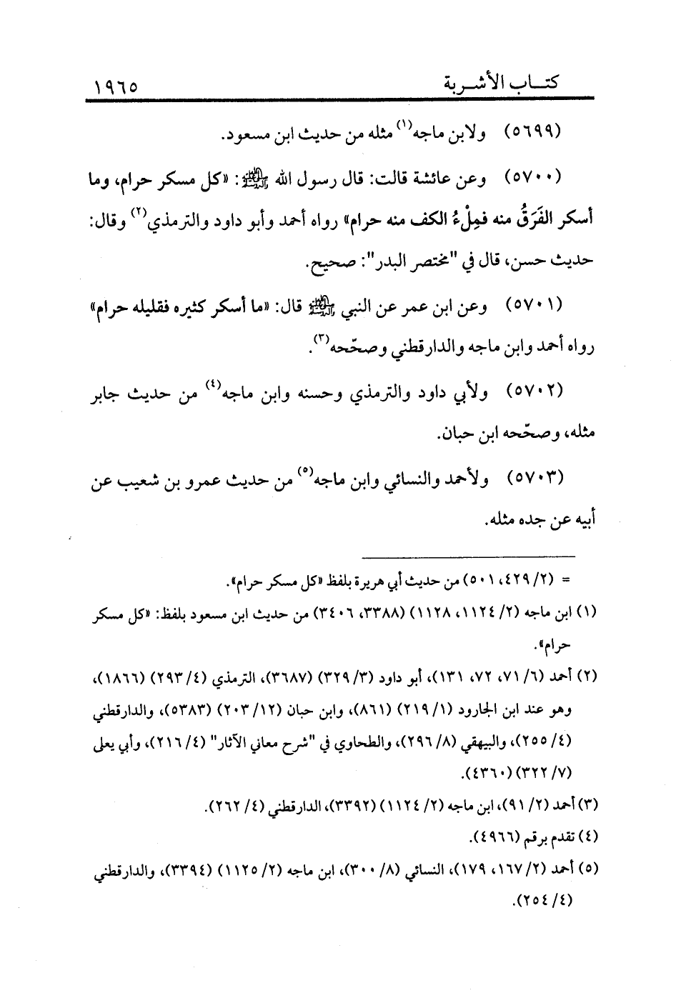 5701 - وعن ابن عمر عن النبي - صلى الله عليه وسلم - قال: «ما أسكر كثيره فقليله حرام» رواه أحمد وابن ماجة والدارقطني وصححه (¬3) .
