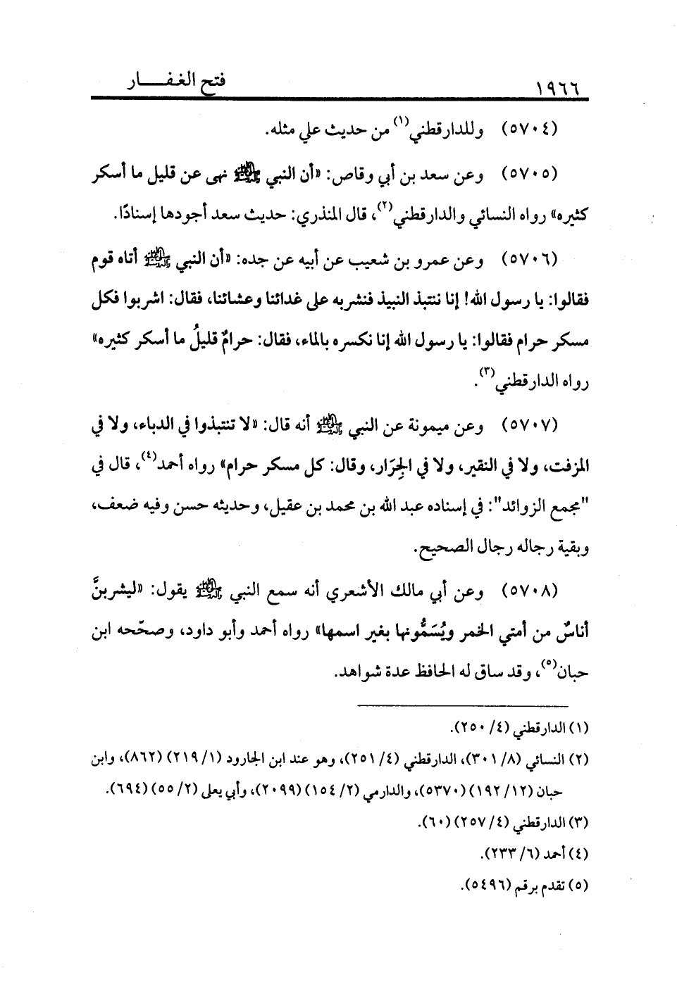 5705 - وعن سعد بن أبي وقاص أن النبي - صلى الله عليه وسلم - «نهى عن قليل ما أسكر كثيره» رواه النسائي والدارقطني (¬2) ، قال المنذري: حديث سعد أجودها إسنادًا.