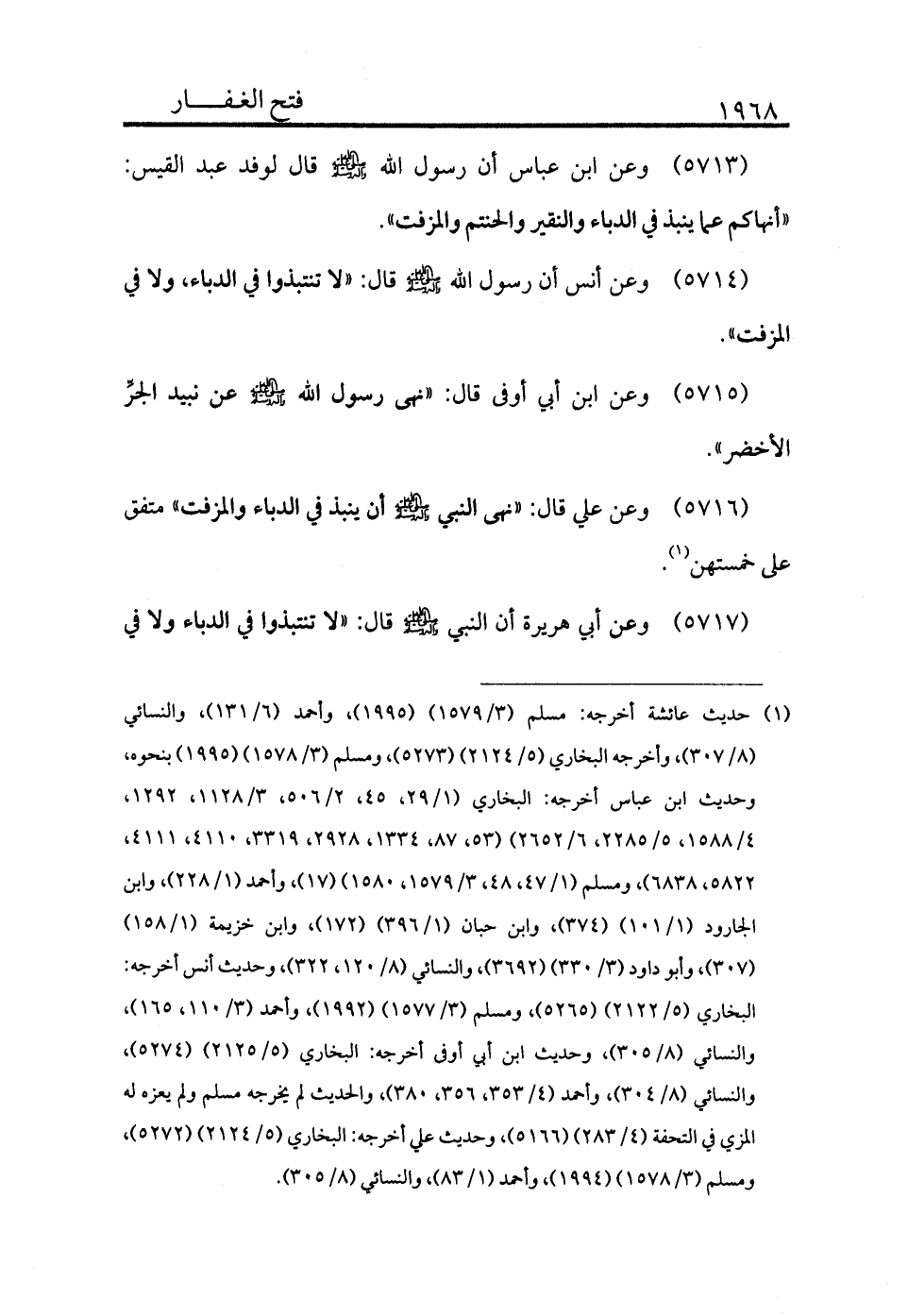 5713 - وعن ابن عباس أن رسول الله - صلى الله عليه وسلم - قال لوفد عبد القيس: «أنهاكم عما ينبذ في الدباء والنقير والحنتم والمزفت» .
