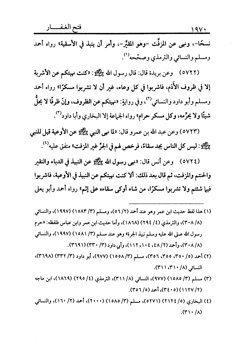 5722 - وعن بريدة قال: قال رسول الله - صلى الله عليه وسلم -: «كنت نهيتكم عن الأشربة إلا في ظروف الأدم فاشربوا في كل وعاء غير أن لا تشربوا مسكرًا» رواه أحمد ومسلم وأبو داود والنسائي (¬2) ، وفي رواية: «نهيتكم عن الظروف وأن ظرفًا لا يحل شيئًا ولا يحرمه، وكل مسكر حرام» رواه الجماعة إلا البخاري وأبا داود (¬3) .