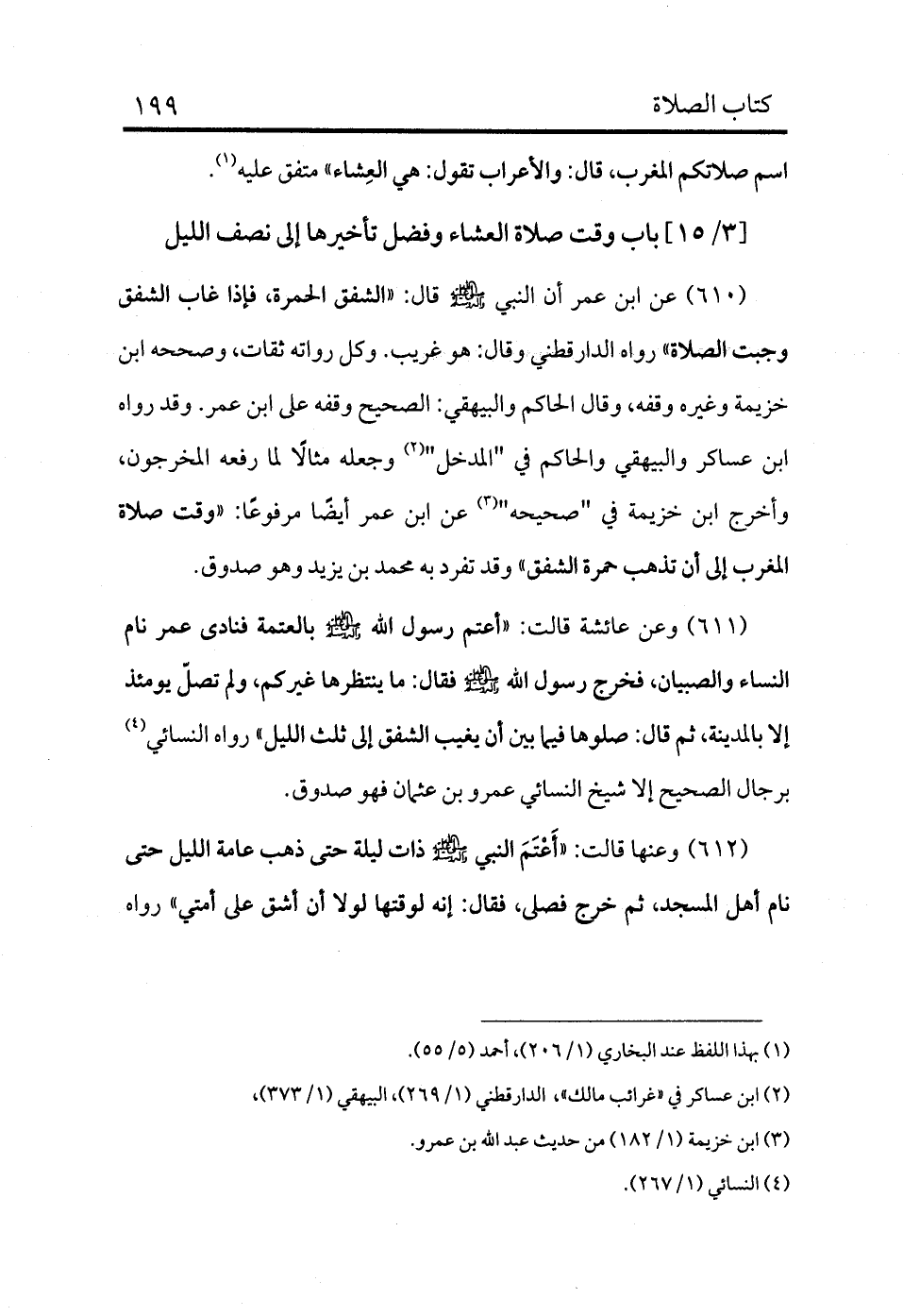 610 - عن ابن عمر أن النبي - صلى الله عليه وسلم - قال: «الشفق الحمرة، فإذا غاب الشفق وجبت الصلاة» رواه الدارقطني وقال: هو غريب. وكل رواته ثقات، وصححه ابن خزيمة وغيره وقفه، وقال الحاكم والبيهقي: الصحيح وقفه على ابن عمر. وقد رواه ابن عساكر والبيهقي والحاكم في "المدخل" (¬2) وجعله مثالًا لما رفعه المخرجون، وأخرج ابن خزيمة في صحيحه (¬3) عن ابن عمر أيضًا مرفوعًا: «وقت صلاة المغرب إلى أن تذهب حمرة الشفق» وقد تفرد به محمد بن يزيد وهو صدوق.