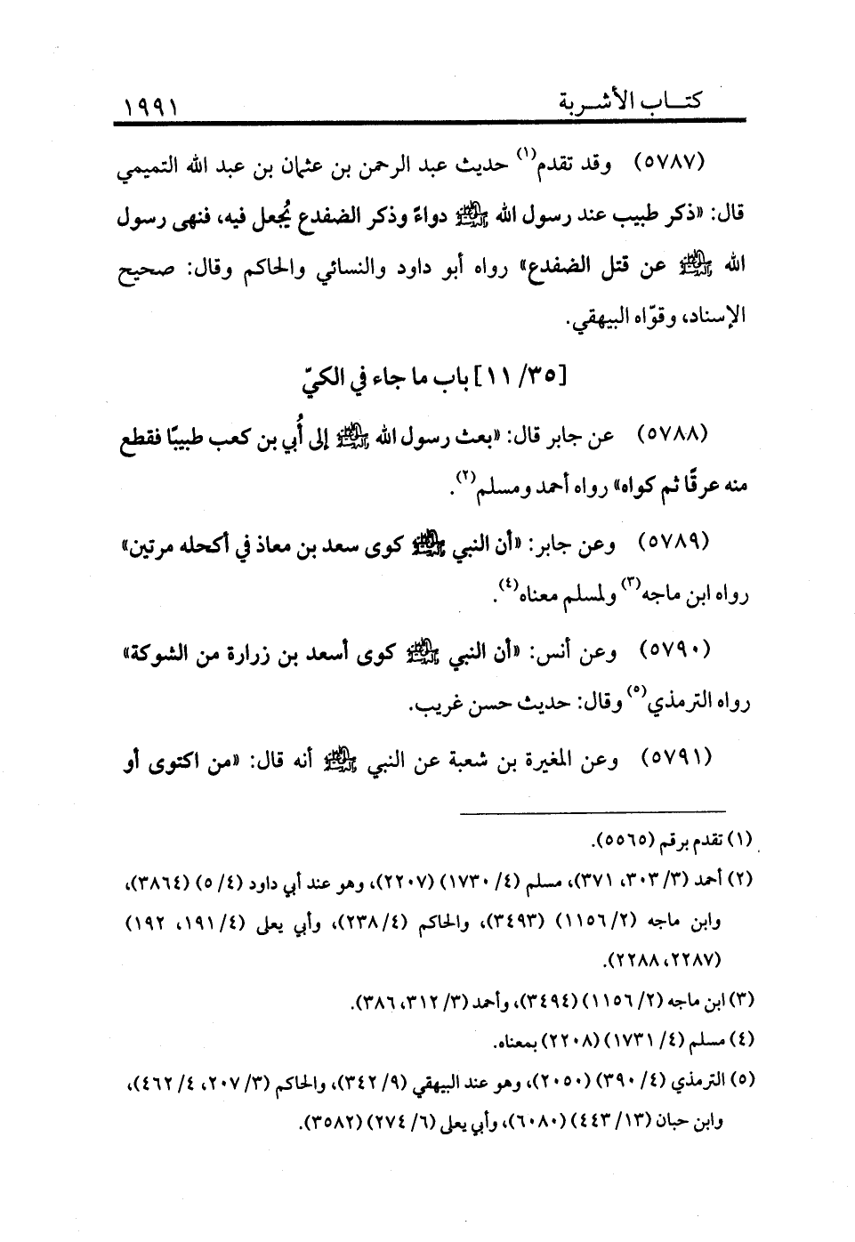 5788 - عن جابر قال: «بعث رسول الله - صلى الله عليه وسلم - إلى أُبي بن كعب طبيبًا فقطع منه عرقًا ثم كواه» رواه أحمد ومسلم (¬2) .