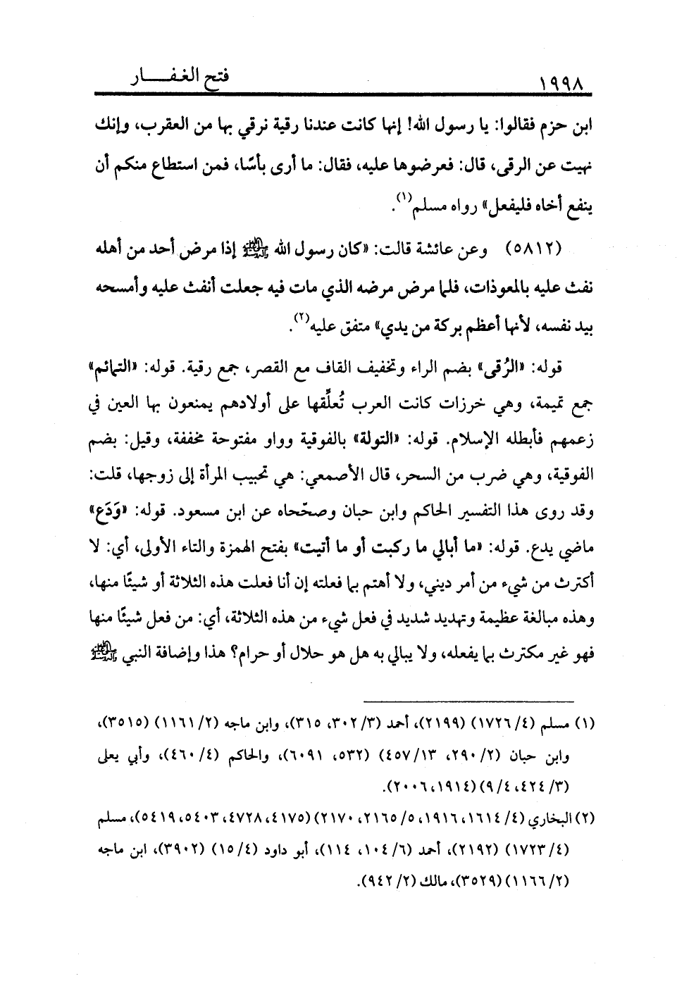 5812 - وعن عائشة قالت: «كان رسول الله - صلى الله عليه وسلم - إذا مرض أحد من أهله نفث عليه بالمعوذات، فلما مرض مرضه الذي مات فيه جعلت أنفث عليه وأمسحه بيد نفسه لأنها أعظم بركة من يدي» متفق عليه (¬2) .