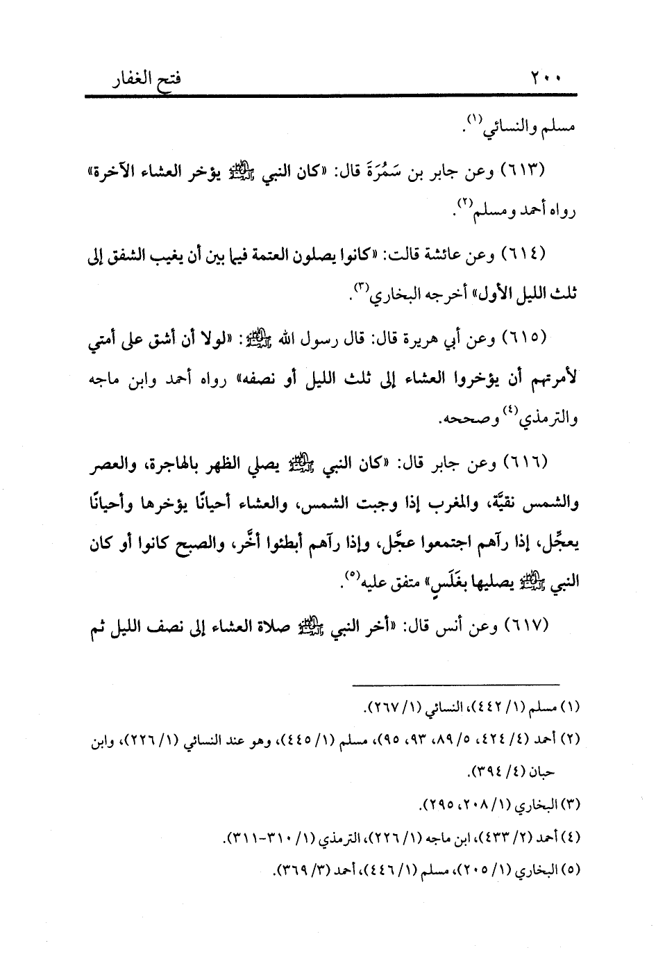 613 - وعن جابر بن سَمُرَةَ قال: «كان النبي - صلى الله عليه وسلم - يؤخر العشاء الآخرة» رواه أحمد ومسلم (¬2) .