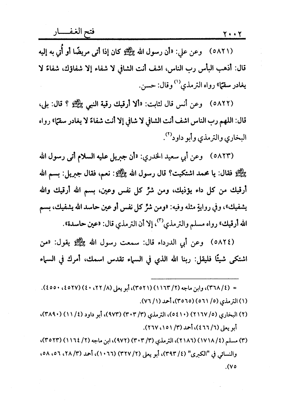 5822 - وعن أنس قال لثابت: «ألا أرقيك رقية النبي - صلى الله عليه وسلم -؟ قال: بلى، قال: اللهم رب الناس اشف أنت الشافي لا شافي إلا أنت شفاء لا يغادر سقمًا» . رواه البخاري والترمذي وأبو داود (¬2) .