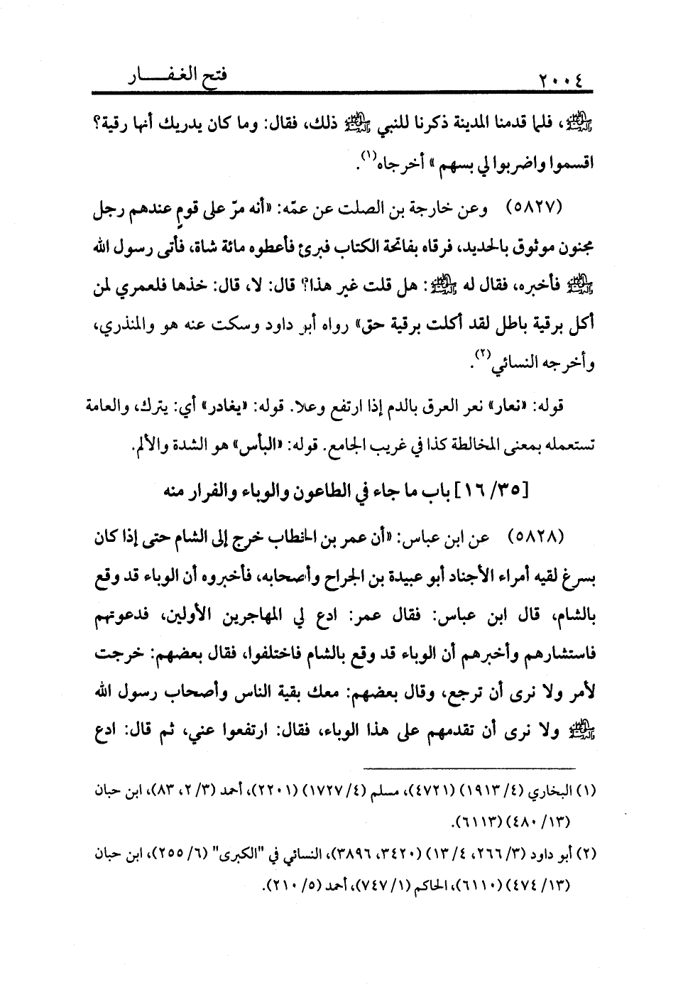 5828 - عن ابن عباس «أن عمر بن الخطاب خرج إلى الشام حتى إذا كان بسرغ لقيه أمراء الأجناد وأبو عبيدة بن الجراح وأصحابه فأخبروه أن الوباء قد وقع بالشام، قال ابن عباس: فقال عمر: ادع لي المهاجرين الأولين فدعوتهم فاستشارهم وأخبرهم أن الوباء قد وقع بالشام فاختلفوا، فقال بعضهم: خرجت لأمر ولا نرى أن نرجع، وقال بعضهم: معك بقية الناس وأصحاب رسول الله - صلى الله عليه وسلم - ولا نرى أن تقدمهم على هذا الوباء، فقال: ارتفعوا عني، ثم قال: ادع