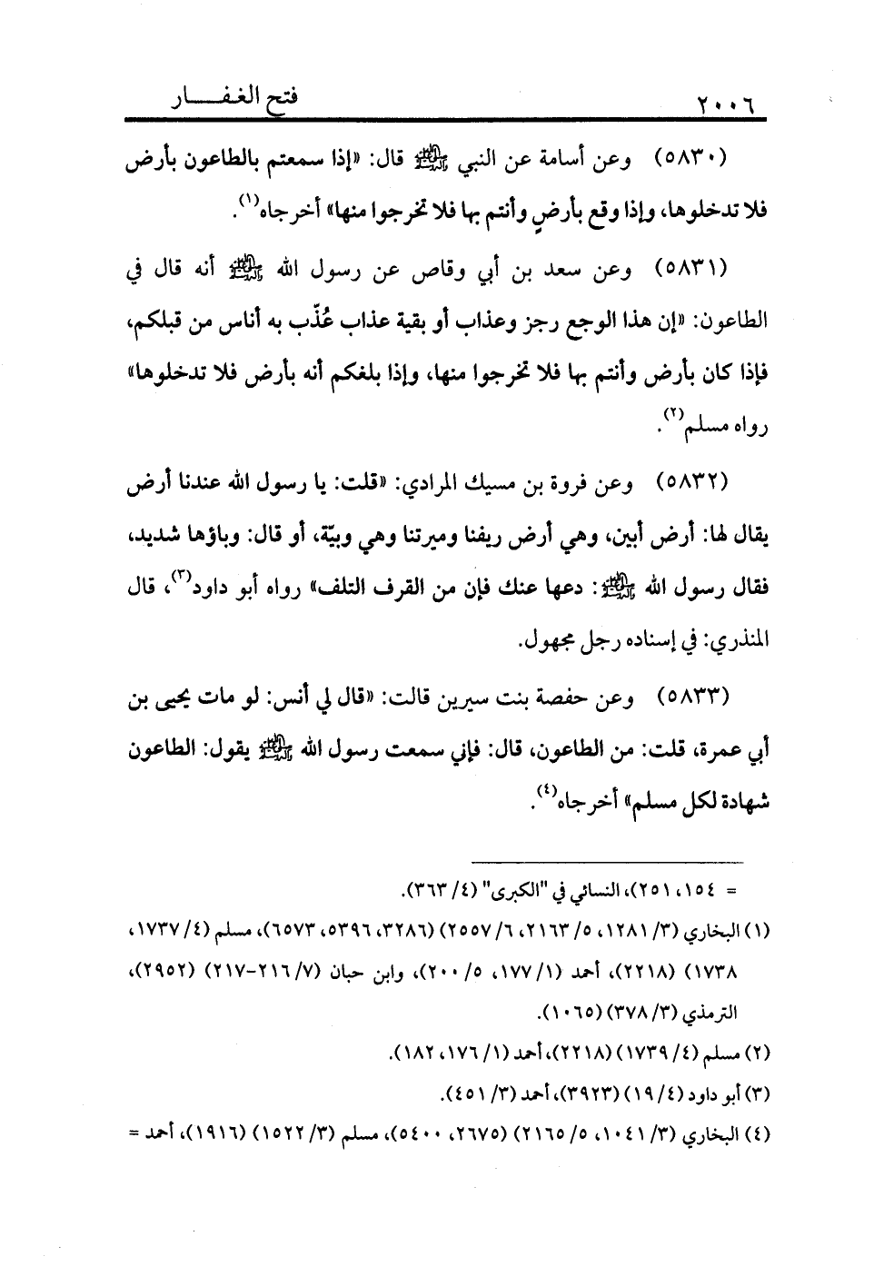 5833 - وعن حفصة بنت سيرين قالت: «قال لي أنس لو مات يحيى بن أبي عمرة قلت من الطاعون، قال: فإني سمعت رسول الله - صلى الله عليه وسلم - يقول: الطاعون شهادة لكل مسلم» أخرجاه (¬4) .