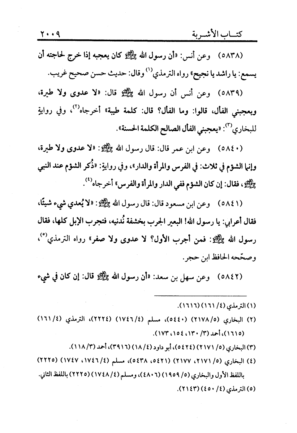 5841 - وعن ابن مسعود قال: قال رسول الله - صلى الله عليه وسلم -: «لا يعدي شيء شيئًا، فقال أعرابي: يا رسول الله! البعير الجرب بخشفه ندنيه، فتجرب الإبل كلها، فقال رسول الله - صلى الله عليه وسلم -: فمن أجرب الأول لا عدوى ولا صفر» رواه الترمذي (¬5) وصححه الحافظ ابن حجر.