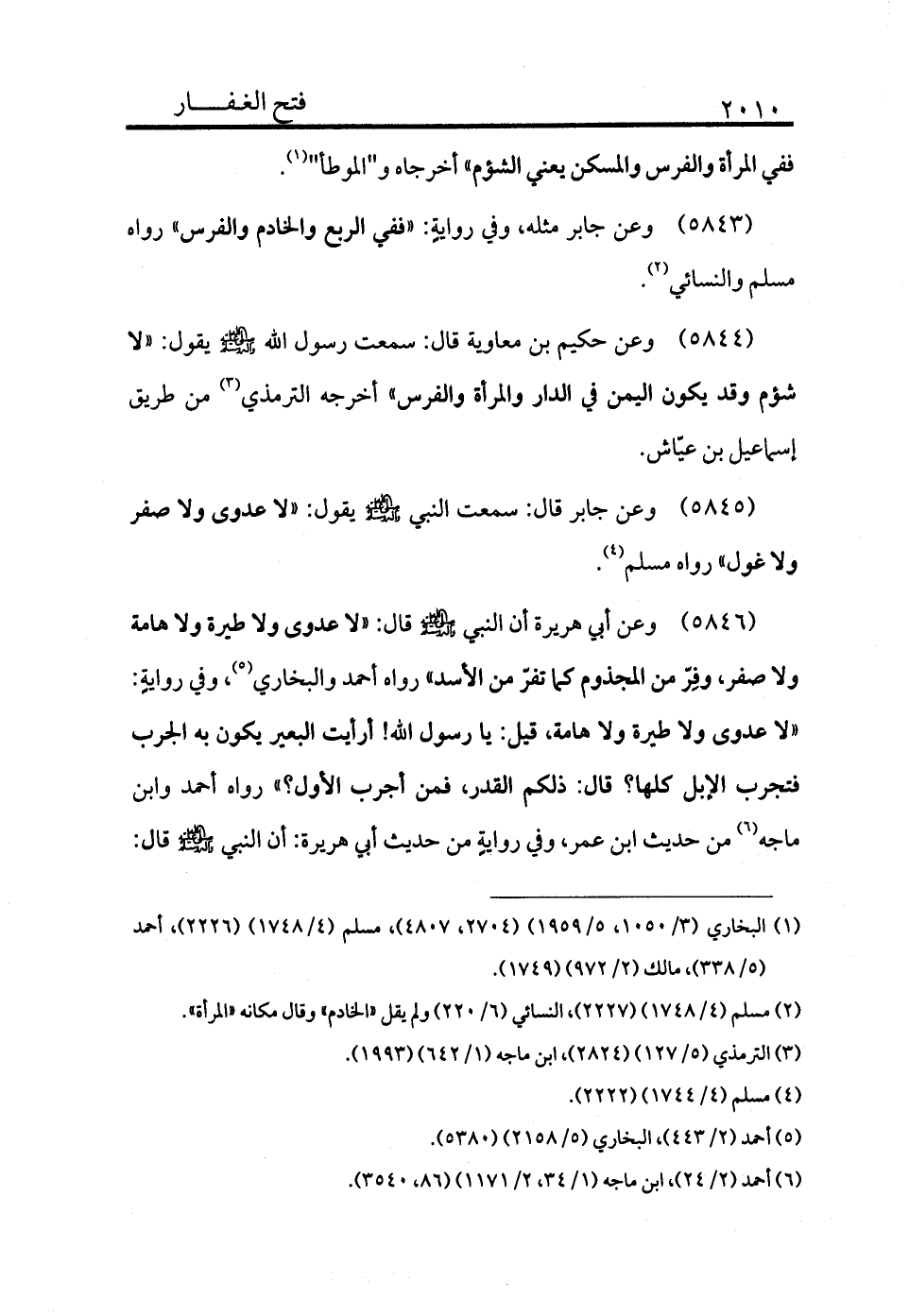 5844 - وعن حكيم بن معاوية قال: سمعت رسول الله - صلى الله عليه وسلم - يقول: «لا شؤم وقد يكون اليمن في الدار والمرأة والفرس» أخرجه الترمذي (¬3) من طريق إسماعيل بن عياش.