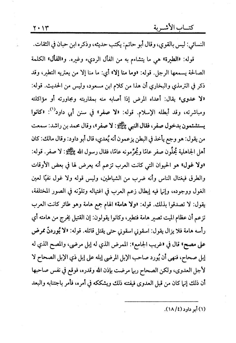 قوله: «الطيرة» هي ما يتشاءم به من الفال الردي وغيره، و «الفال» الكلمة الصالحة يسمعها الرجل. قوله: «وما منا إلا» أي ما منا إلا من يعتريه التطير. وقد ذكر في الترمذي والبخاري أن هذا من كلام ابن مسعود، وليس من الحديث. قوله: «لا عدوى» يقال أعداه المرض إذا أصابه منه بمقاربته ومجاورته أو مؤاكلته ومباشرته، وقد أبطله الإسلام. قوله: «لا صفر» في سنن أبي داود (¬1) «كانوا يستشئمون بدخول صفر، فقال النبي - صلى الله عليه وسلم -: لا صفر» وقال محمد بن راشد: سمعت من يقول: هو وجع يأخذ في البطن يزعمون أنه يُعدي، قال أبو داود: وقال مالك: كان أهل الجاهلية يحلون صفر عامًا ويحرمونه عامًا، فقال رسول الله - صلى الله عليه وسلم -: لا صفر. قوله: «ولا غول» هو الحيوان التي كانت العرب تزعم أنه يعرض لها في بعض الأوقات والطرق فيغتال الناس وأنه ضرب من الشيطان، وليس قوله ولا غول نفيًا لعين الغول ووجوده، وإنما فيه إبطال زعم العرب في اغتياله وتلونه في الصور المختلفة يقول: لا تصدقوا بذلك. قوله: «ولا هامة» الهام جمع هامة وهو طائر كانت العرب تزعم أن عظام الميت تصير هامة فتطير وكانوا يقولون إن القتيل يخرج من هامته أي رأسه هامة فلا يزال يقول: اسقوني اسقوني حتى يقتل قاتله.