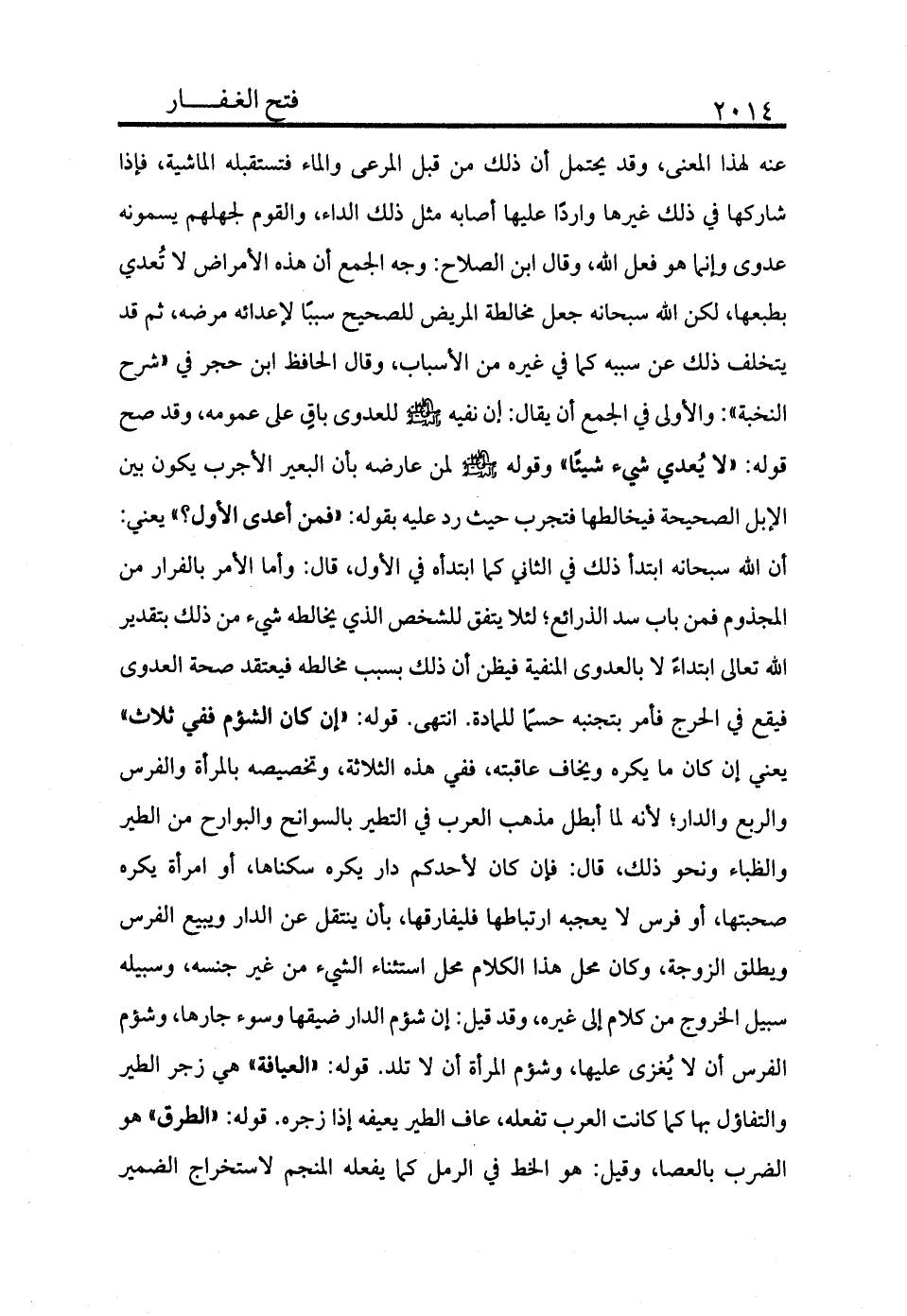 عنه لهذا المعنى وقد يحتمل أن ذلك من قبل المرعى والماء فتستقبله الماشية، فإذا شاركها في ذلك غيرها وارد عليها أصابه مثل ذلك الداء والقوم لجهلهم يسمونه عدوى وإنما هو فعل الله، وقال ابن الصلاح: وجه الجمع أن هذه الأمراض لا تعدي بطبعها، لكن الله سبحانه جعل مخالطة المريض للصحيح سببًا لاعدائه مرضه، ثم قد يتخلف ذلك عن سببه كما في غيره من الأسباب، وقال الحافظ ابن حجر في شرح النخبة والأولى في الجمع أن يقال أن نفيه - صلى الله عليه وسلم - للعدوى باق على عمومه، وقد صح قوله: «لا يعدي شيء شيئًا» وقوله - صلى الله عليه وسلم - لمن عارضه بأن البعير الأجرب يكون بين الإبل الصحيحة فيخالطها فتجرب حيث رد عليه بقوله: «فمن أعدى الأول» يعني أن الله سبحانه ابتدأ ذلك في الثاني كما ابتدأه في الأول، قال: وأما الأمر بالفرار من المجذوم فمن باب سد الذرائع؛ لئلا يتفق للشخص الذي يخالطه شيء من ذلك بتقدير الله تعالى ابتداءً لا بالعدوى المنفية فيظن أن ذلك بسبب مخالطه فيعتقد صحة العدوى فيقع في الحرج فأمر بتجنبه حسمًا للمادة. انتهى.