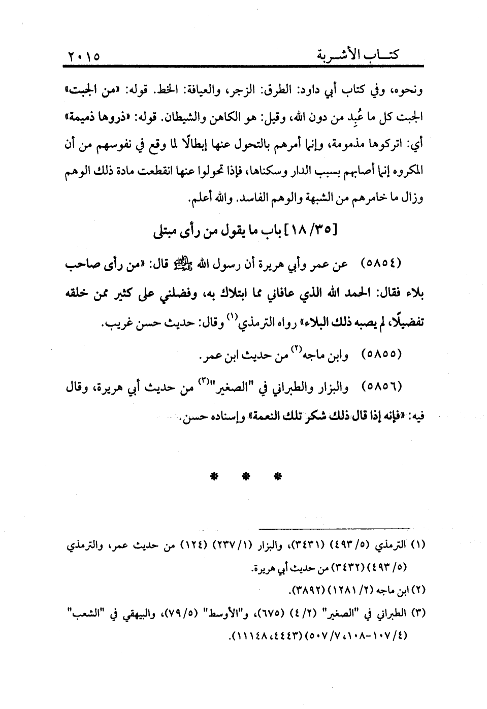 5854 - عن عمر وأبي هريرة أن رسول الله - صلى الله عليه وسلم - قال: «من رأى صاحب بلاء فقال: الحمد الله الذي عافاني وابتلاك به، وفضلني على كثير ممن خلقه تفضيلًا لم يصبه ذلك البلاء» رواه الترمذي (¬1) ، وقال: حديث حسن غريب.