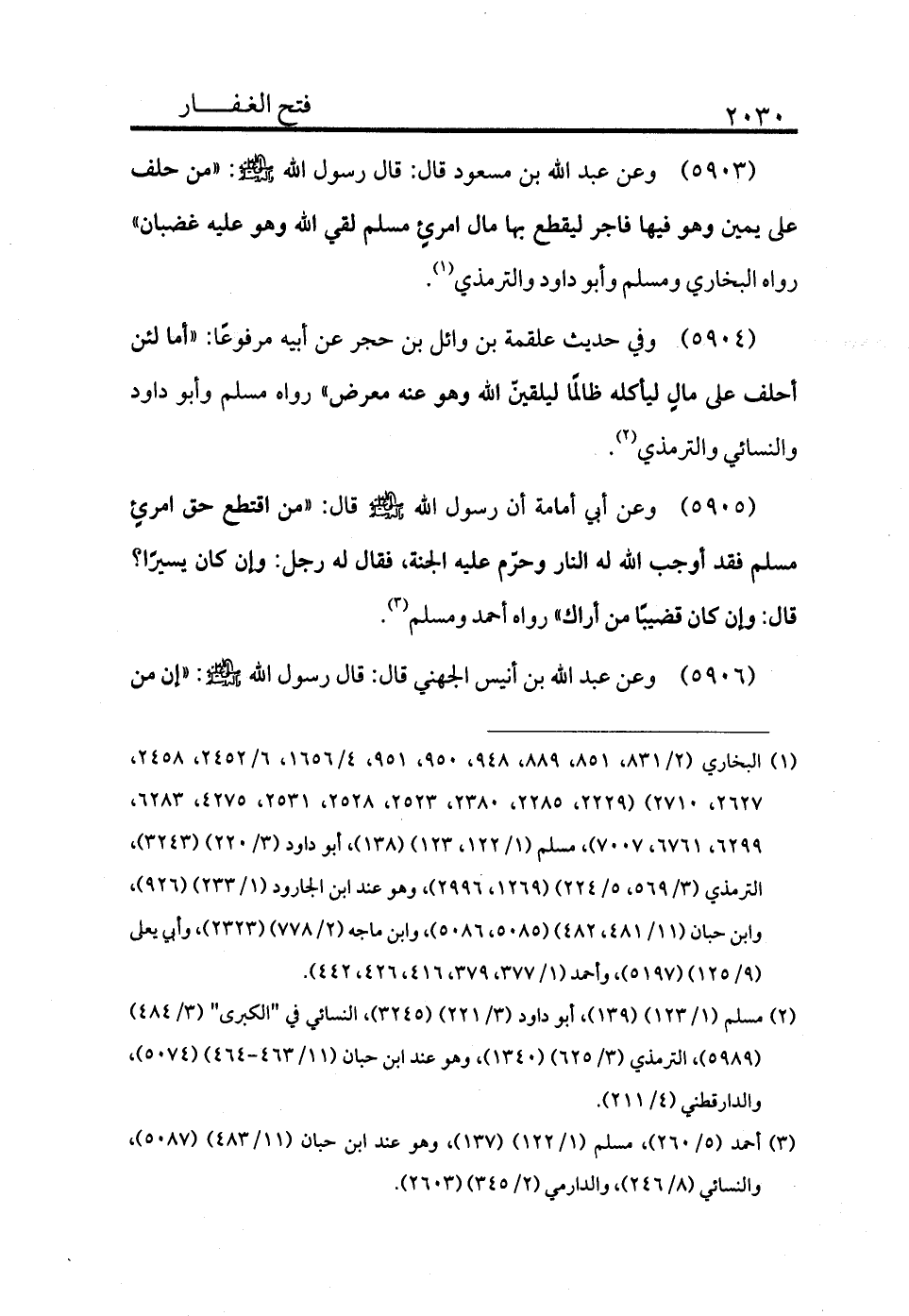 5903 - وعن عبد الله بن مسعود قال: قال رسول الله - صلى الله عليه وسلم -: «من حلف على يمين وهو فيها فاجر ليقطع بها مال امرئٍ مسلم لقي الله وهو عليه غضبان» رواه البخاري ومسلم وأبو داود والترمذي (¬1) .