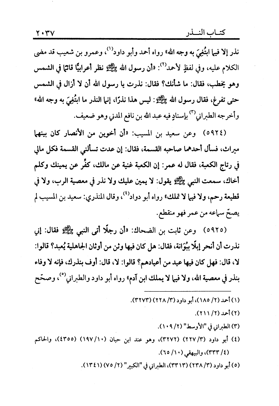 نذر إلا فيما ابتغي به وجه الله» رواه أحمد وأبو داود (¬1) ، وعمرو بن شعيب قد مضى الكلام عليه، وفي لفظ لأحمد (¬2) : «أن رسول الله - صلى الله عليه وسلم - نظر أعرابيًا قائمًا في الشمس وهو يخطب، فقال: ما شأنك؟ فقال: نذرت يا رسول الله أن لا أزال في الشمس حتى تفرغ، فقال رسول الله - صلى الله عليه وسلم -: ليس هذا نذرًا، إنما النذر ما ابتغي به وجه الله» وأخرجه الطبراني (¬3) بإسناد فيه عبد الله بن نافع المدني وهو ضعيف.