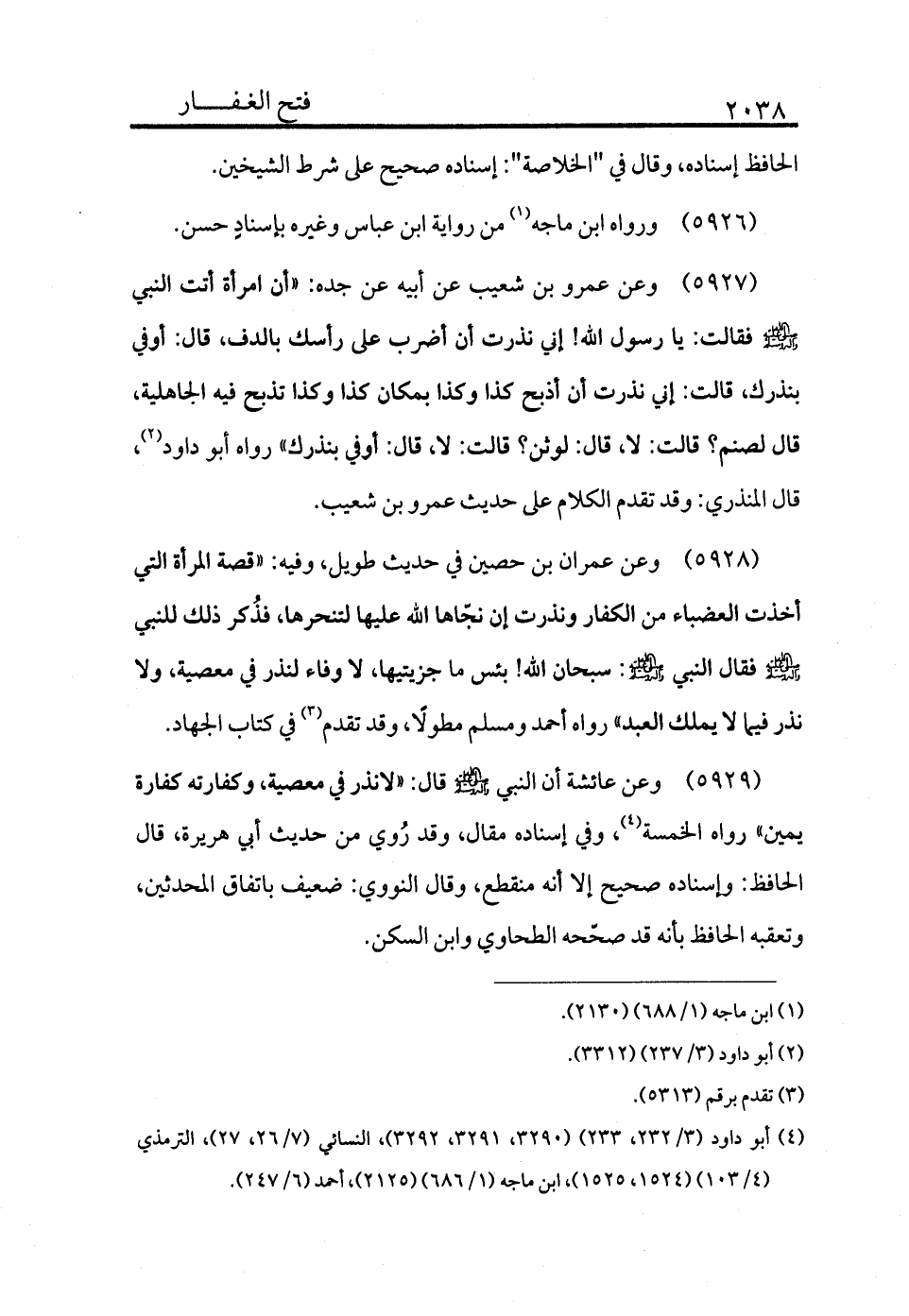 5927 - وعن عمرو بن شعيب عن أبيه عن جده «أن امرأة أتت النبي - صلى الله عليه وسلم - فقالت: يا رسول الله! إني نذرت أن أضرب على رأسك بالدف، قال: أوفي بنذرك، قالت: إني نذرت أن أذبح كذا وكذا بمكان كذا وكذا تذبح فيه الجاهلية، قال لصنم؟ قالت: لا، قال: لوثن؟ قالت: لا، قال: أوفي بنذرك» رواه أبو داود (¬2) ، قال المنذري: وقد تقدم الكلام على حديث عمرو بن شعيب.