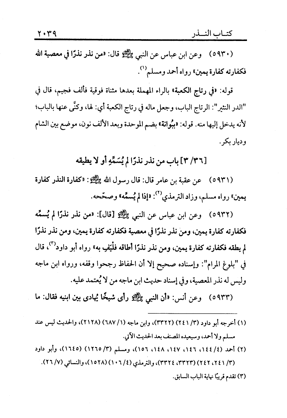 5930 - وعن ابن عباس عن النبي - صلى الله عليه وسلم - قال: «من نذر نذرًا في معصية الله فكفارته كفارة يمين» رواه أحمد ومسلم (¬1) .