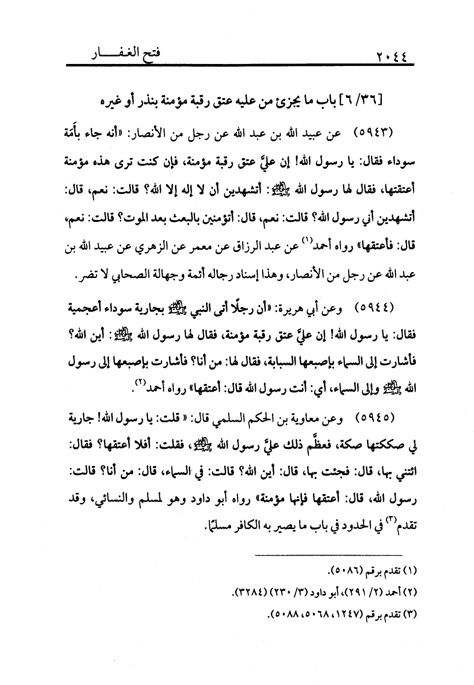5944 - وعن أبي هريرة «أن رجلًا أتى النبي - صلى الله عليه وسلم - بجارية سوداء أعجمية، فقال: يا رسول الله! إن عليَّ عتق رقبة مؤمنة، فقال لها رسول الله - صلى الله عليه وسلم -: أين الله؟ فأشارت إلى السماء بإصبعها السبابة، فقال لها: من أنا؟ فأشارت بإصبعها إلى رسول الله - صلى الله عليه وسلم - وإلى السماء أي أنت رسول الله قال: أعتقها» رواه أحمد (¬2) .