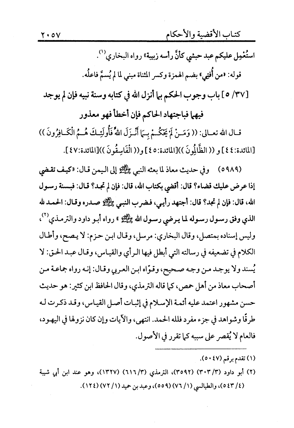 5989 - وفي حديث معاذ لما بعثه النبي - صلى الله عليه وسلم - إلى اليمن قال: «كيف تقضي إذا عرض عليك قضاء؟ قال: أقضي بكتاب الله، قال: فإن لم تجد؟ قال: فبسنة رسول الله، قال: فإن لم تجد؟ قال: أجتهد رأيي، فضرب النبي - صلى الله عليه وسلم - صدره وقال: الحمد لله الذي وفق رسول رسوله لما يرضي رسول الله» رواه أبو داود والترمذي (¬2) ، وليس إسناده بمتصل، وقال البخاري: مرسل، وقال ابن حزم: لا يصح، وأطال الكلام في تضعيفه في رسالته التي أبطل فيها الرأي والقياس، وقال عبد الحق: لا يسند ولا يوجد من وجه صحيح، وقواه ابن العربي وقال: إنه رواه جماعة من أصحاب معاذ من أهل حمص، كما قاله الترمذي، وقال الحافظ ابن كثير: هو حديث حسن مشهور اعتمد عليه أئمة الإسلام في إثبات أصل القياس، وقد ذكرت له طرقًا وشواهد في جزء مفرد فلله الحمد. انتهى. والآيات وإن كان نزولها في اليهود، فالعام لا يقصر على سببه كما تقرر في الأصول.