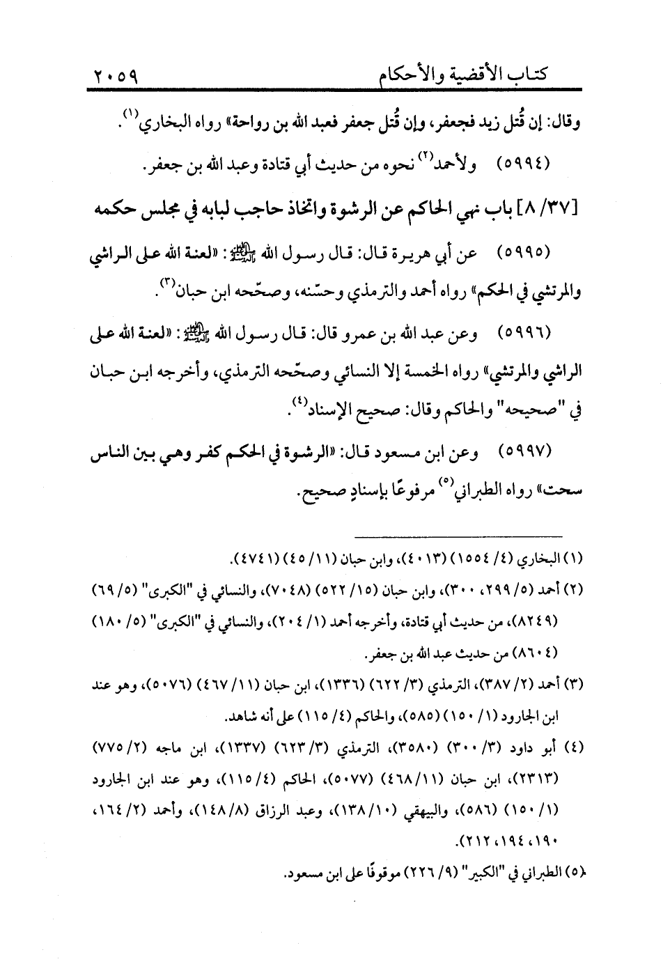 5997 - وعن ابن مسعود قال: «الرشوة في الحكم كفر وهي بين الناس سحت» رواه الطبراني (¬5) مرفوعًا بإسناد صحيح.