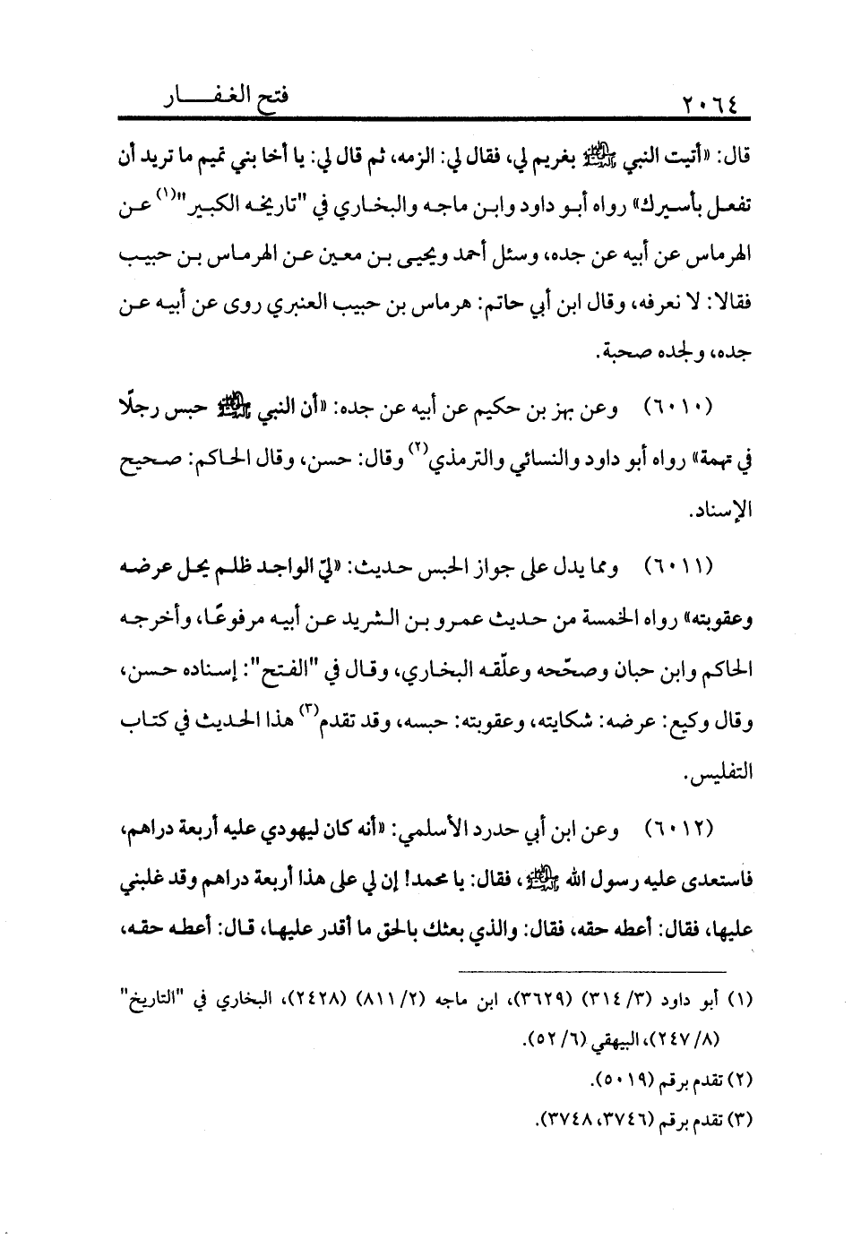6010 - وعن بهز بن حكيم عن أبيه عن جده أن النبي - صلى الله عليه وسلم -: «حبس رجلًا في تهمة» رواه أبو داود والنسائي والترمذي (¬2) ، وقال: حسن، وقال الحاكم صحيح الإسناد.