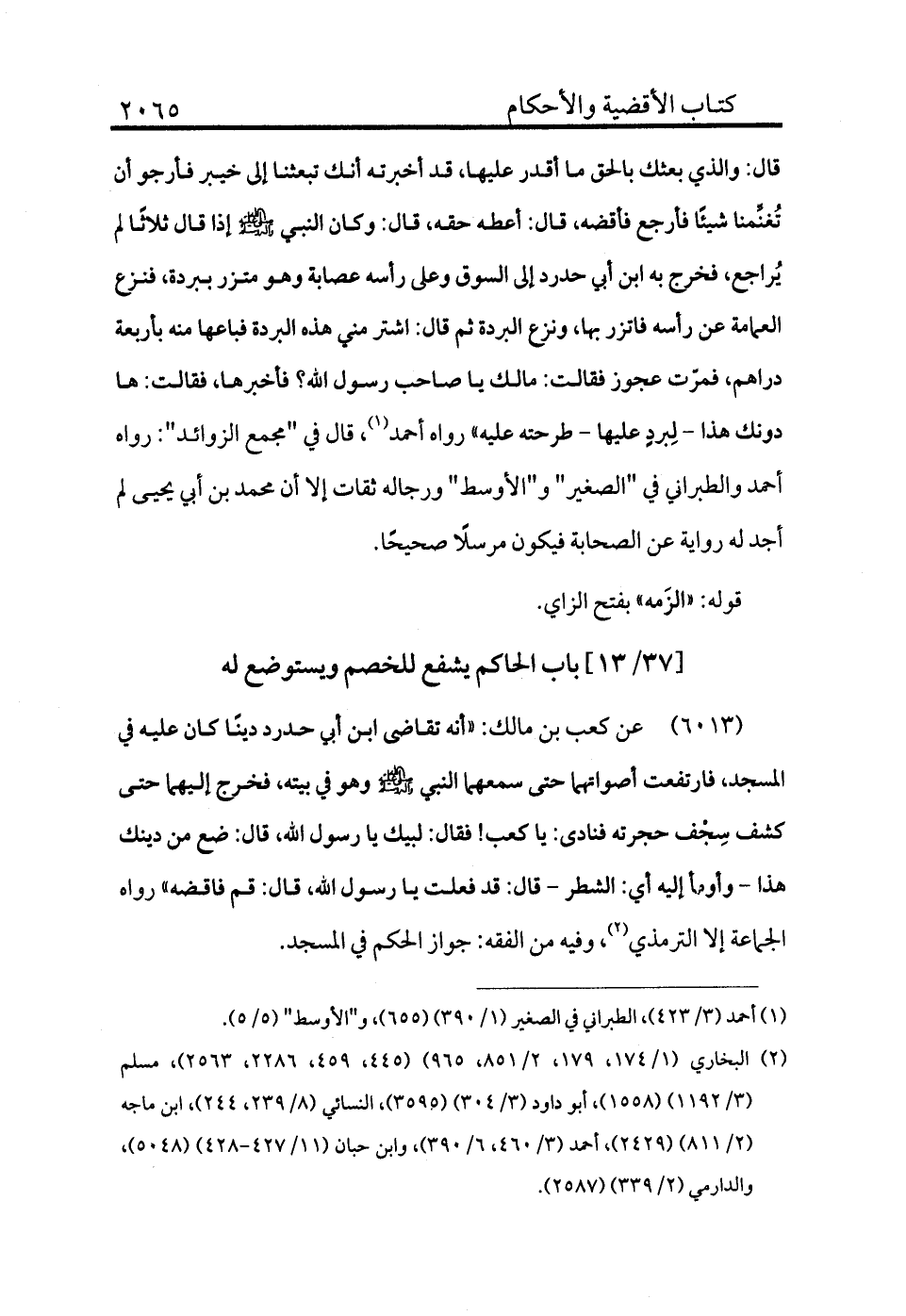 6013 - عن كعب بن مالك «أنه تقاضى ابن أبي حدرد دينًا كان عليه في المسجد فارتفعت أصواتهما حتى سمعهما النبي - صلى الله عليه وسلم - وهو في بيته: فخرج إليهما حتى كشف سجف حجرته فنادى: يا كعب! فقال: لبيك يا رسول الله، قال: ضع من دينك هذا وأومأ إليه أي الشطر، قال: قد فعلت يا رسول الله، قال: قم فاقضه» رواه الجماعة إلا الترمذي (¬2) ، وفيه من الفقه جواز الحكم في المسجد.