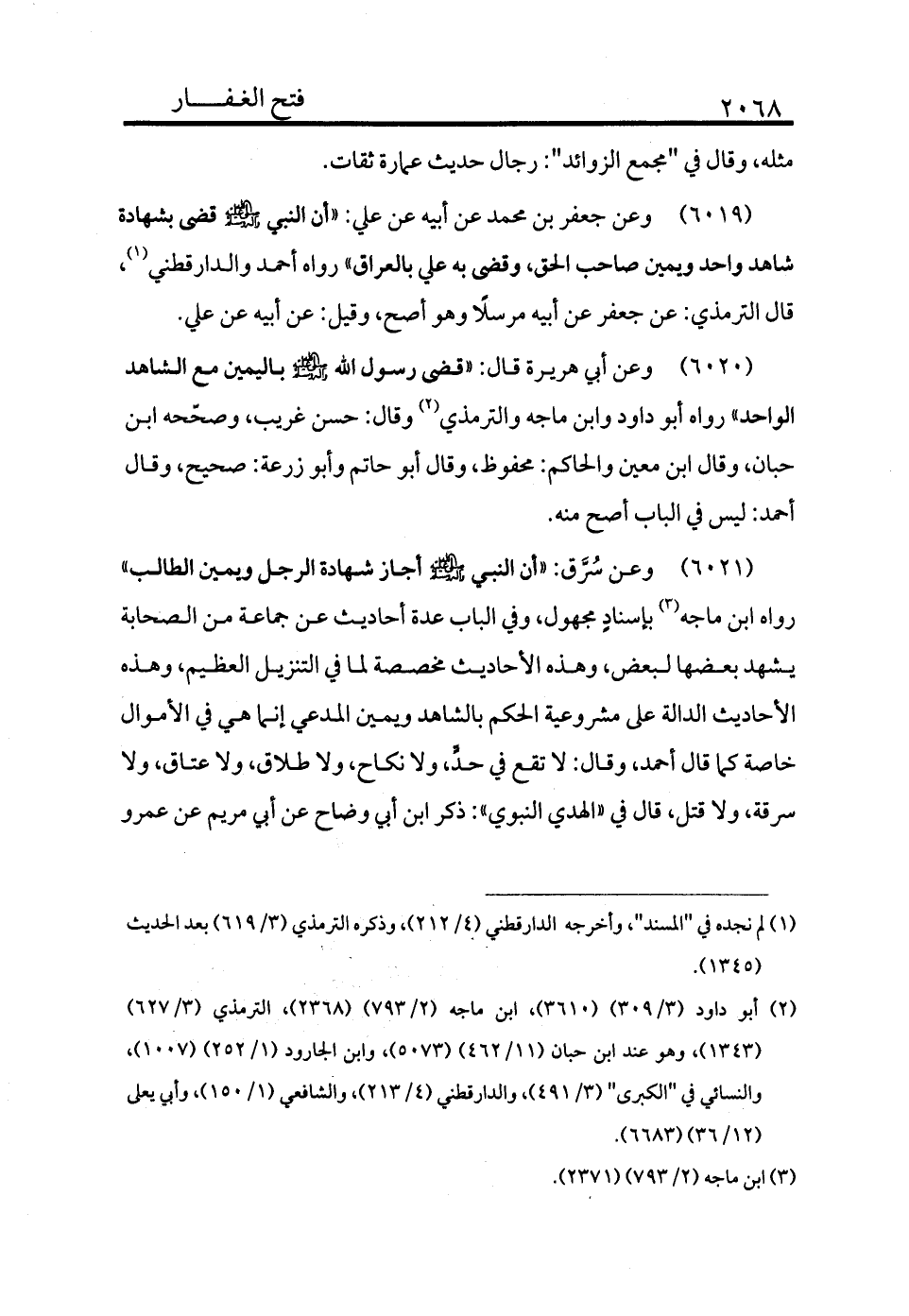 6020 - وعن أبي هريرة قال: «قضى رسول الله - صلى الله عليه وسلم - باليمين مع الشاهد الواحد» رواه أبو داود وابن ماجة والترمذي (¬2) ، وقال: حسن غريب، وصححه ابن حبان وقال ابن معين والحاكم: محفوظ، وقال أبو حاتم وأبو زرعة: صحيح، وقال: أحمد ليس في الباب أصح منه.