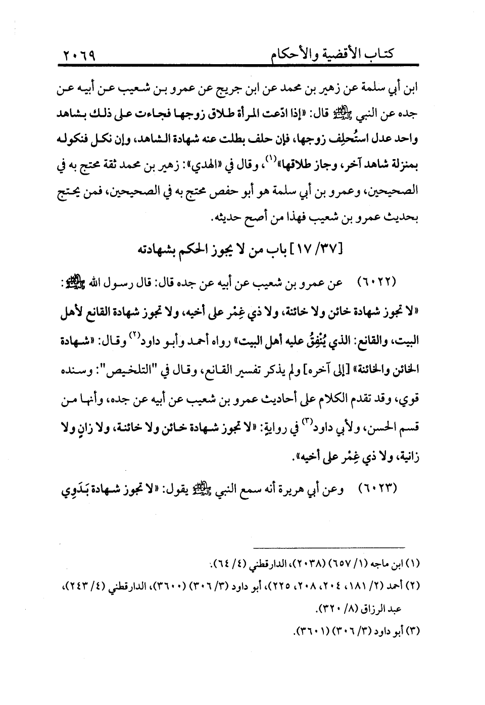 6022 - عن عمرو بن شعيب عن أبيه عن جده قال: «قال رسول الله - صلى الله عليه وسلم -: لا تجوز شهادة خائن ولا خائنة، ولا ذي غمر على أخيه، ولا تجوز شهادة القانع لأهل البيت، والقانع الذي ينفق عليه أهل البيت» رواه أحمد وأبو داود (¬2) ، وقال: «شهادة الخائن والخائنة» ولم يذكر تفسير القانع وقال في "التلخيص": وسنده قوي وقد تقدم الكلام على أحاديث عمرو بن شعيب عن أبيه عن جده، وأنها من قسم الحسن ولأبي داود (¬3) في رواية: «لا تجوز شهادة خائن ولا خائنة ولا زانٍ ولا زانية ولا ذي غمر على أخيه» .