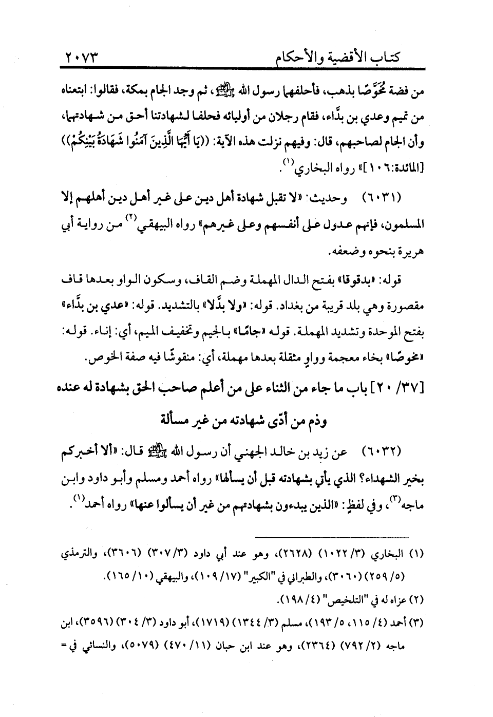 6032 - عن زيد بن خالد الجهني أن رسول الله - صلى الله عليه وسلم - قال: «ألا أخبركم بخير الشهداء الذي يأتي بشهادته قبل أن يسألها» رواه أحمد ومسلم وأبو داود وابن ماجة (¬3) ، وفي لفظ: «الذين يبدأون بشهادتهم من غير أن يسألوا عنها» رواه أحمد (¬4) .