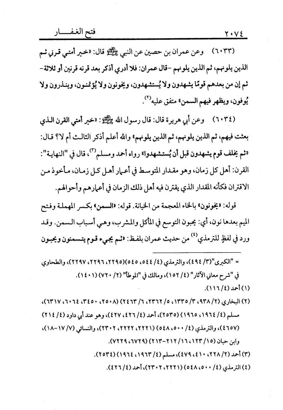 6033 - وعن عمران بن حصين عن النبي - صلى الله عليه وسلم - قال: «خير أمتي قرني ثم الذين يلونهم، ثم الذين يلونهم -قال عمران: فلا أدري أذكر بعد قرنه قرنين أو ثلاثة- ثم إن من بعدهم قومًا يشهدون ولا يستشهدون، ويخونون ولا يؤتمنون، وينذرون ولا يوفون، ويظهر فيهم السمن» متفق عليه (¬1) .