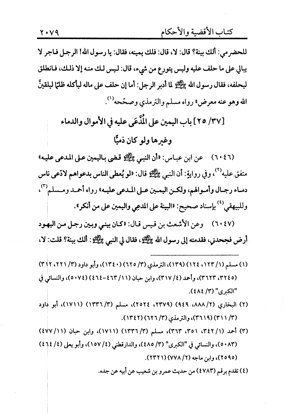 6046 - عن ابن عباس «أن النبي - صلى الله عليه وسلم - قضى باليمين على المدعى عليه» متفق عليه (¬2) ، وفي رواية أن النبي - صلى الله عليه وسلم - قال: «لو يعطى الناس بدعواهم لادعى ناس دماء رجال وأموالهم، ولكن اليمين على المدعى عليه» رواه أحمد ومسلم (¬3) ، وللبيهقي (¬4) بإسناد صحيح: «البينة على المدعي واليمين على من أنكر» .