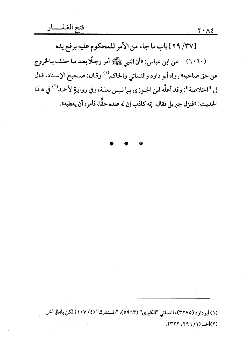 6060 - عن ابن عباس «أن النبي - صلى الله عليه وسلم - أمر رجلًا بعد ما حلف بالخروج عن حق صاحبه» رواه أبو داود والنسائي والحاكم (¬1) ، وقال: صحيح الإسناد في "الخلاصة"، وقد أعلَّه ابن الجوزي بما ليس بعلة، وفي رواية لأحمد (¬2) في هذا الحديث «فنزل جبريل فقال: إنه كاذب إن له عنده حقًا فأمره أن يعطيه» .