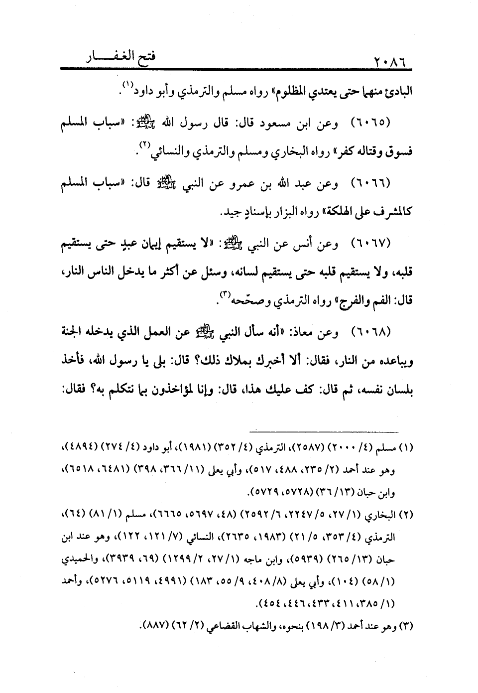 6065 - وعن ابن مسعود قال: قال رسول الله - صلى الله عليه وسلم -: «سباب المسلم فسوق وقتاله كفر» رواه البخاري ومسلم والترمذي والنسائي (¬2) .