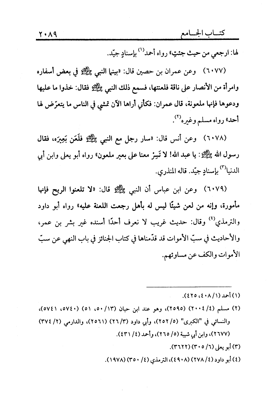 6077 - وعن عمران بن حصين قال: «بينما النبي - صلى الله عليه وسلم - في بعض أسفاره وامرأة من الأنصار على ناقة فلعنتها، فسمع ذلك النبي - صلى الله عليه وسلم - فقال: خذوا ما عليها ودعوها فإنها ملعونة، قال عمران: فكأني أراها الآن تمشي في الناس ما يتعرض لها أحد» رواه مسلم وغيره (¬2) .