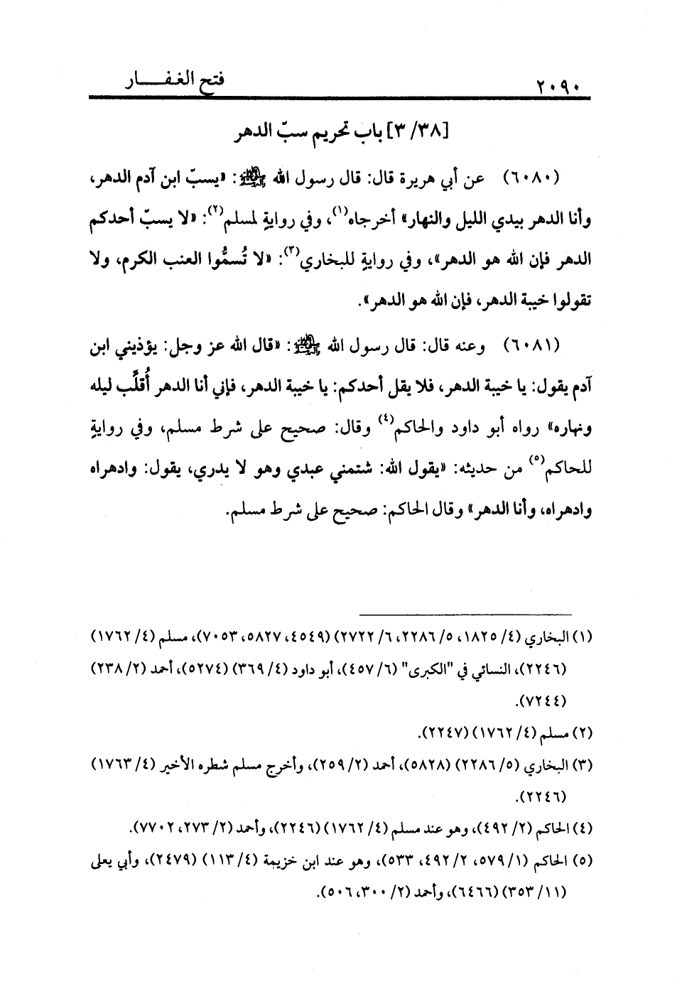 6080 - عن أبي هريرة قال: قال رسول الله - صلى الله عليه وسلم -: «يسب ابن آدم الدهر، وأنا الدهر بيدي الليل والنهار» أخرجاه (¬1) ، وفي رواية لمسلم (¬2) : «لا يسب أحدكم الدهر فإن الله هو الدهر» وفي رواية للبخاري (¬3) : «لا تسموا العنب الكرم ولا تقولوا خيبة الدهر، فإن الله هو الدهر» .
