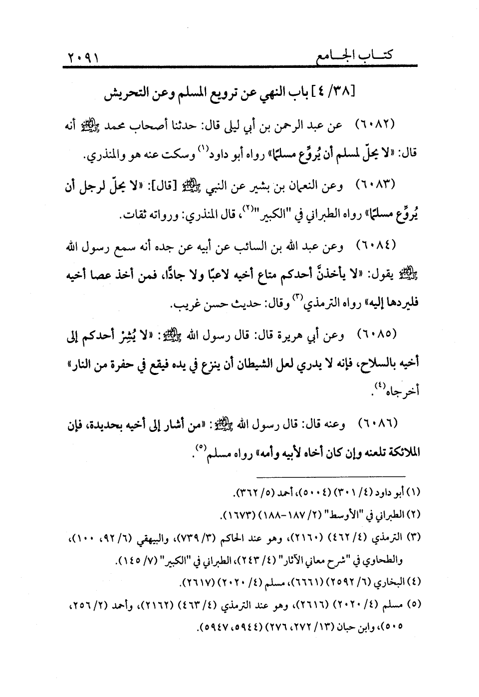 6083 - وعن النعمان بن بشير عن النبي - صلى الله عليه وسلم - قال: «لا يحل لرجل أن يروع مسلمًا» رواه الطبراني في "الكبير" (¬2) ، قال المنذري: ورواته ثقات.