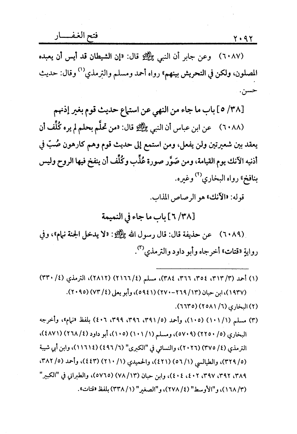 6089 - عن حذيفة قال: قال رسول الله - صلى الله عليه وسلم -: «لا يدخل الجنة نمام» وفي رواية «قتات» أخرجاه وأبو داود والترمذي (¬3) .