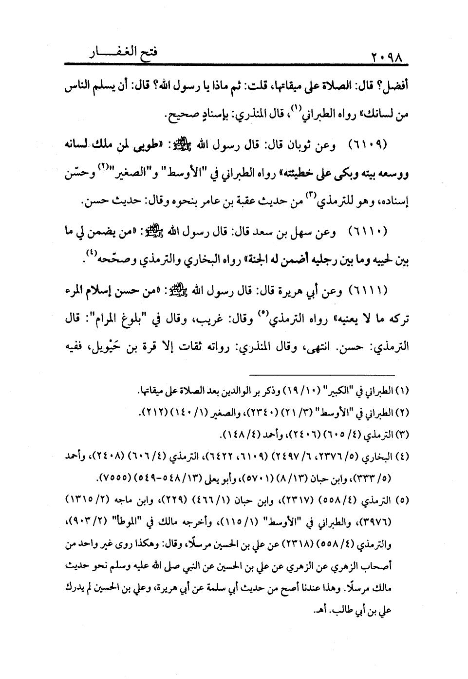 6110 - وعن سهل بن سعد قال: قال رسول الله - صلى الله عليه وسلم -: «من يضمن لي ما بين لحييه، وما بين رجليه أضمن له الجنة» رواه البخاري والترمذي وصححه (¬4) .