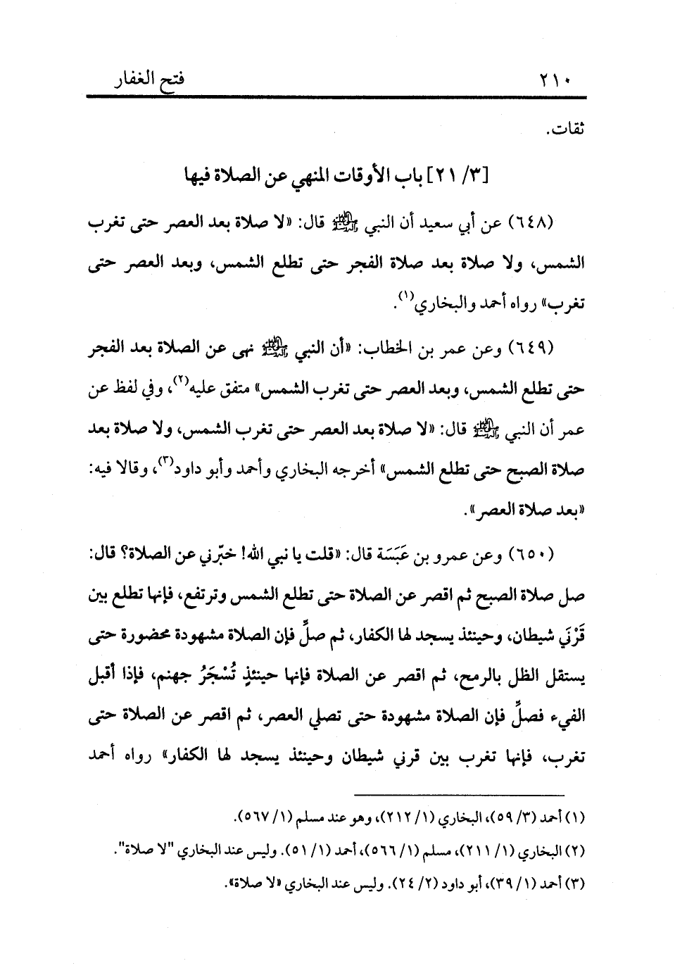 648 - عن أبي سعيد أن النبي - صلى الله عليه وسلم - قال: «لا صلاة بعد العصر حتى تغرب الشمس، ولا صلاة بعد صلاة الفجر حتى تطلع الشمس، وبعد العصر حتى تغرب» رواه أحمد والبخاري (¬1) .