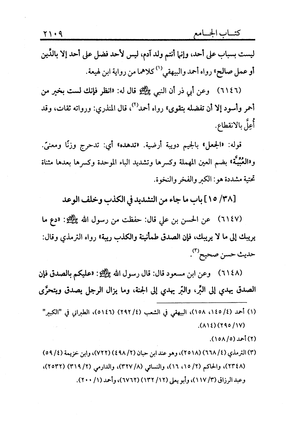 6146 - وعن أبي ذر أن النبي - صلى الله عليه وسلم - قال له: «انظر فإنك لست بخير من أحمر، وأسود إلا أن تفضله بتقوى» رواه أحمد (¬2) ، قال المنذري: ورواته ثقات، وقد أعل بالانقطاع.